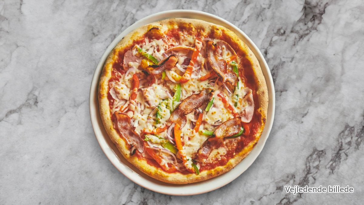 Tomat, ost, løg, rød peberfrugt, chili, hvidløg, bacon og champignon.