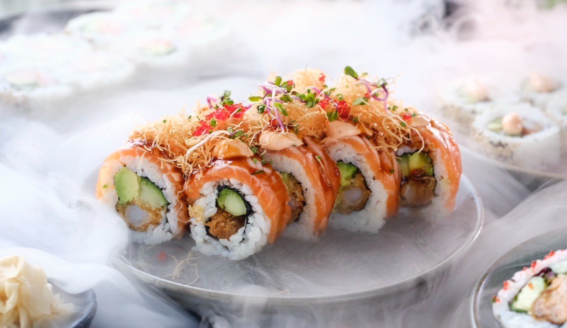Crispy Ebi 8 stk, Big Crispy Laks 6 stk, Nigiri Grillet Laks 2 stk , Roasted Duck , Ris , Crispy Gaozi 6 stk.