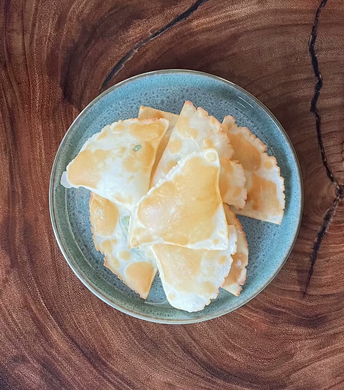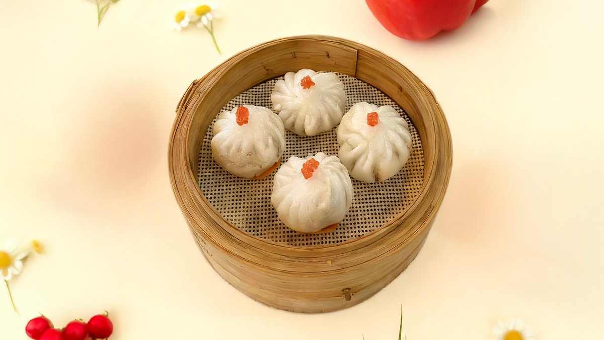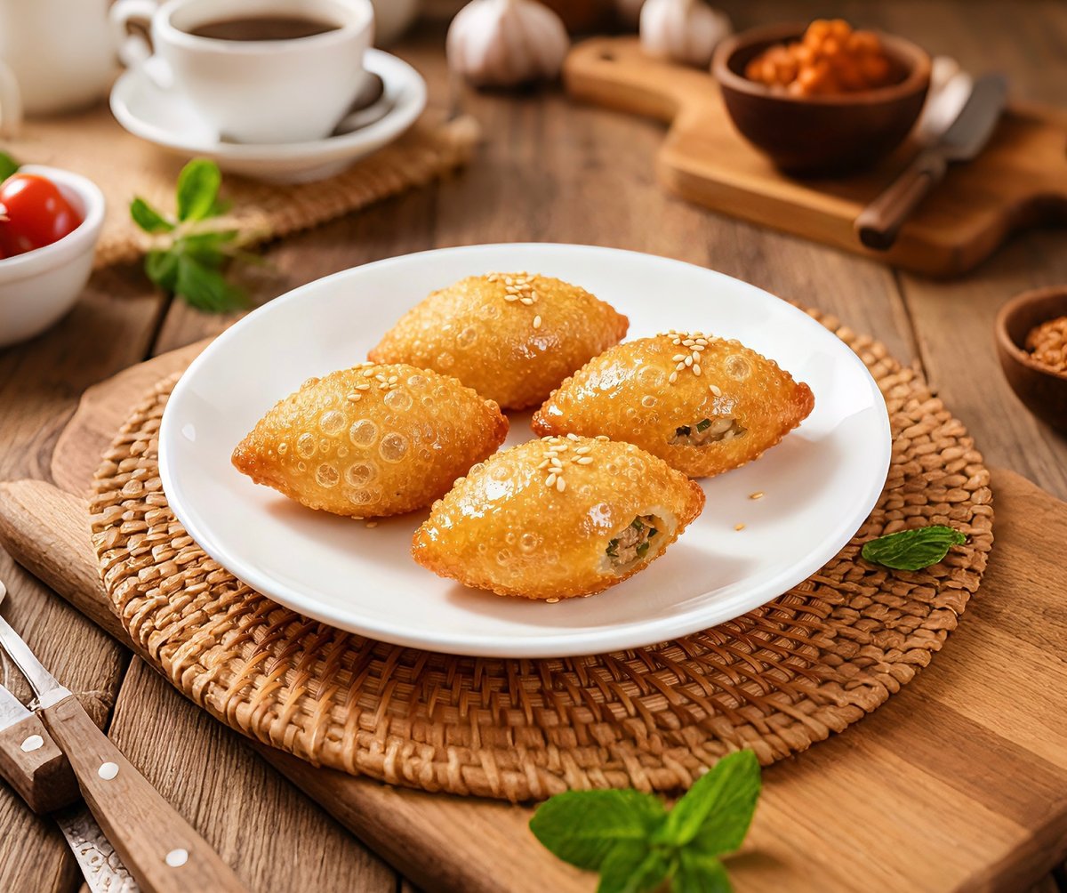 Stegt dejbolle med fyld af kylling og kinesiske grøntsager.