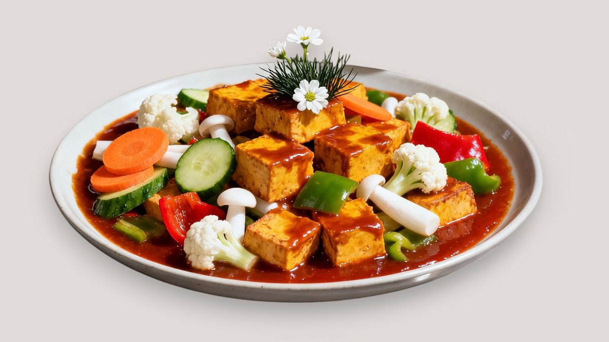 Friteret tofu, ris, avocado, agurk, radise, wakame og marinerede rødløg , edemame bøner. vagamayo.