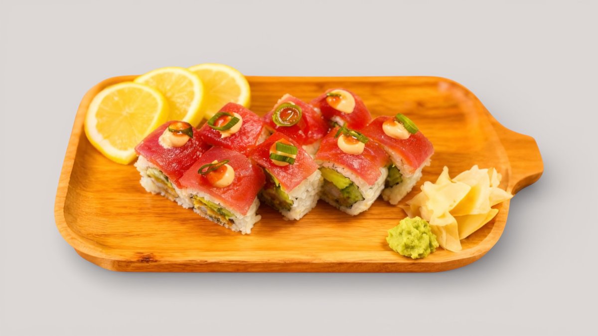 Nigiri: 1 x Laks 1 x Laks New York 1 x Tun Kaburimaki: 8 x Red dragon Futomaki: 6 x Big California Serveres med soya Wasabi og ingefær