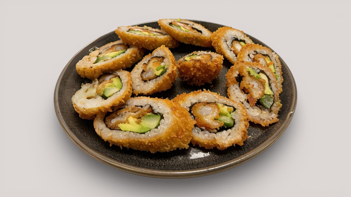 Crispy Ebi, ris, avocado, chilimayonaise, agurk, wakame ,edamame bøner, gulerod, radise, og marinerede rødløg .