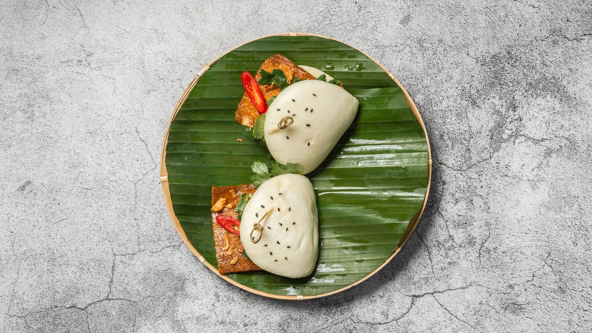 Baobolle med fyld af Chasiu pork, hjemmelavet dressing, syltede daikon og gulerødder, krydrede sprøde jordnødder og ristet skalotteløg, koriander.