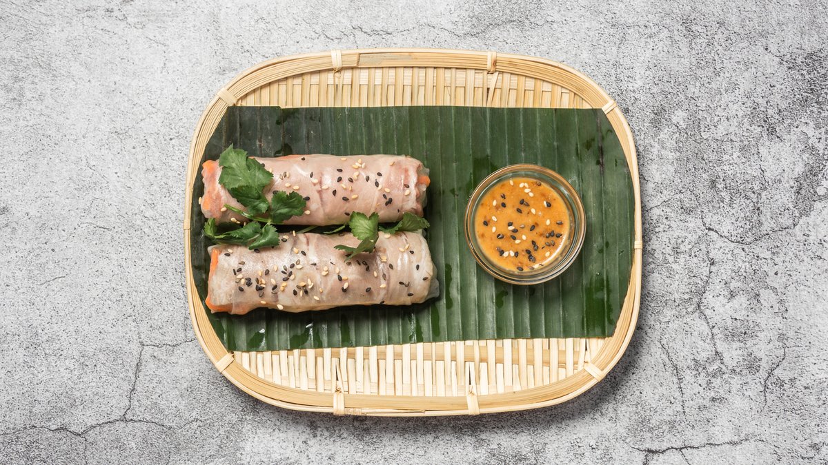 Sommerrulle af rispapir med fyld af BBQ svinekød, grøntsager, hjemmesyltede gulerødder, daikon, mynte, sød basilikum, ristet skalotteløg og jordnødder. Serveres med valgfri sauce.