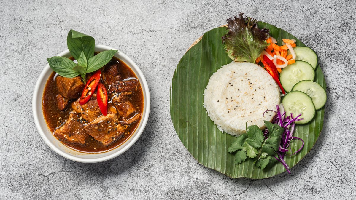 Simret svinekød med karamelsovs og hjemmesyltede grøntsager. Serveres med jasminris.