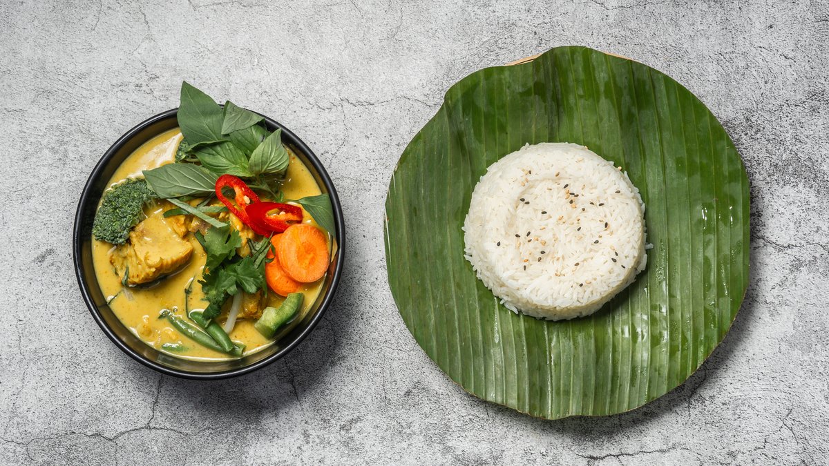 Gul karry med kylling, sød basilikum og grøntsager. Serveres med jasminris.