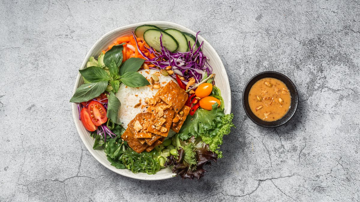 Bowl med fyld af inari tofu, sushiris, hjemmesyltede grøntsager, avocado, edamamebønner, ristede løg, peanuts, koriander og tangsalat. Serveres med goma dressing.