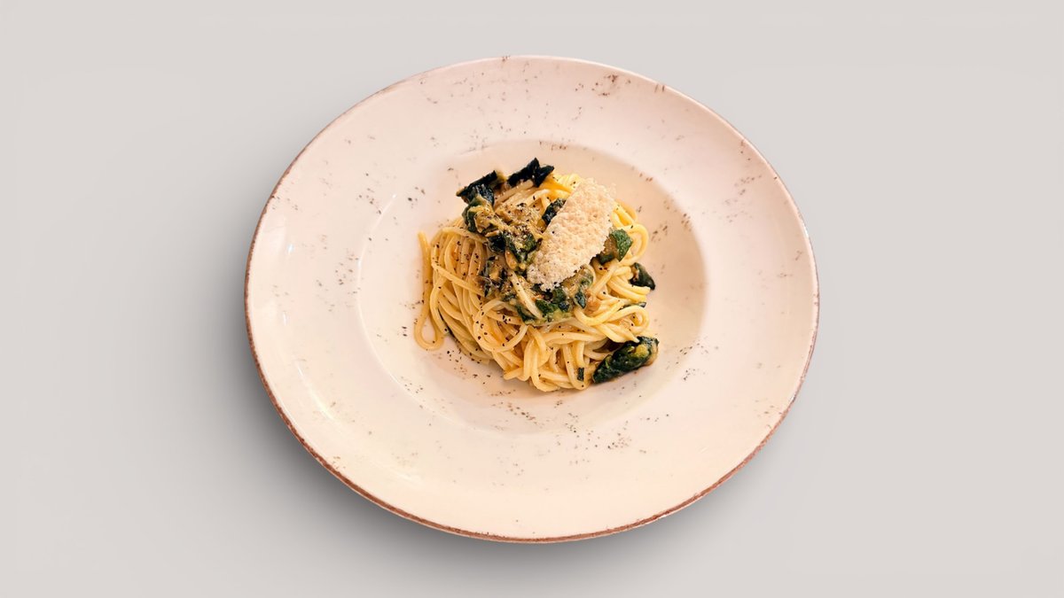 En genopfundet carbonara - uden bacon. Sprødstegt zucchini giver et frisk twist, blandet med en silkeblød æggesauce , persille & masser af parmesan.
