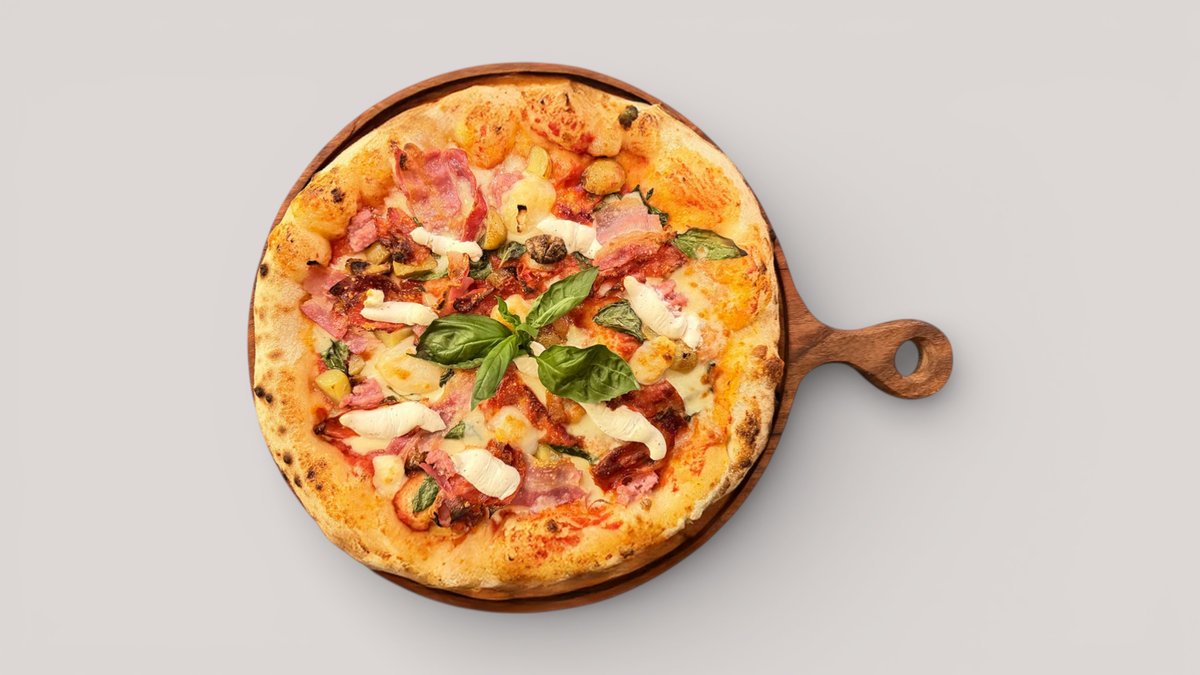 500 g Tomatbaseret dej, toppet med mozzarella, gorgonzola, gedeost, parmesan & ricotta. Færdiggjort med ristede kartofler, champignon og tre slags kød - spicy salami, bacon, italiensk pølse, oregano & basilikum