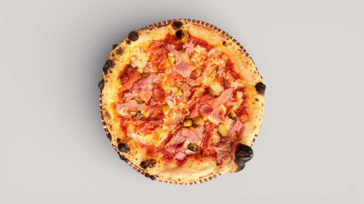 Tomatsauce, mozzarella, kartofler, bacon, italiensk spicy salami & italiensk pølse