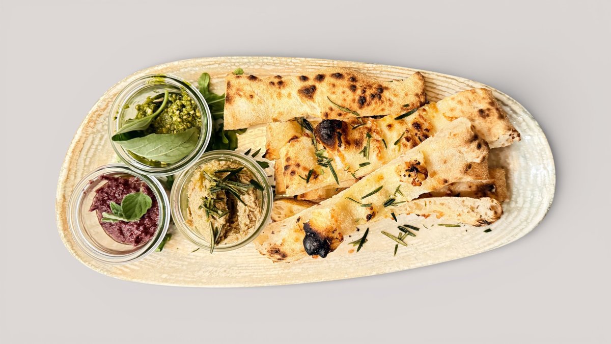Hjemmelavet focaccia, basilikums pesto, hjemmelavet oliven pesto & artiskokcreme