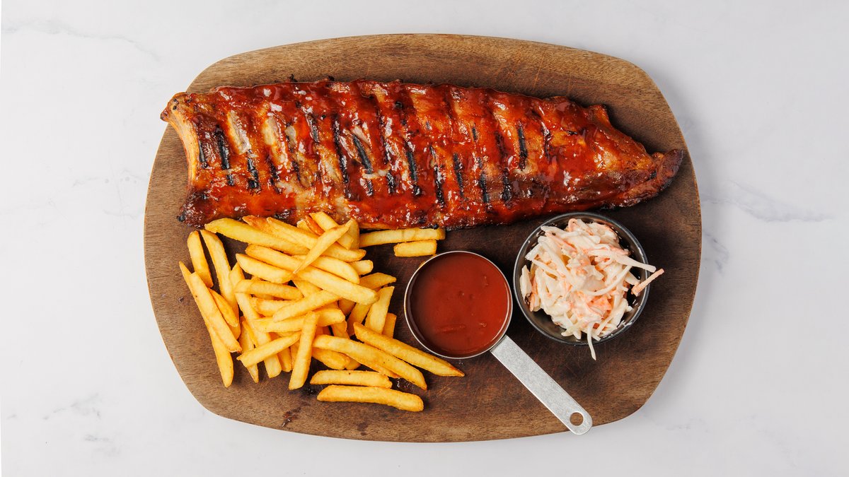 Stor spareribs med barbecue, valgfrie kartofler og valgfri sauce.