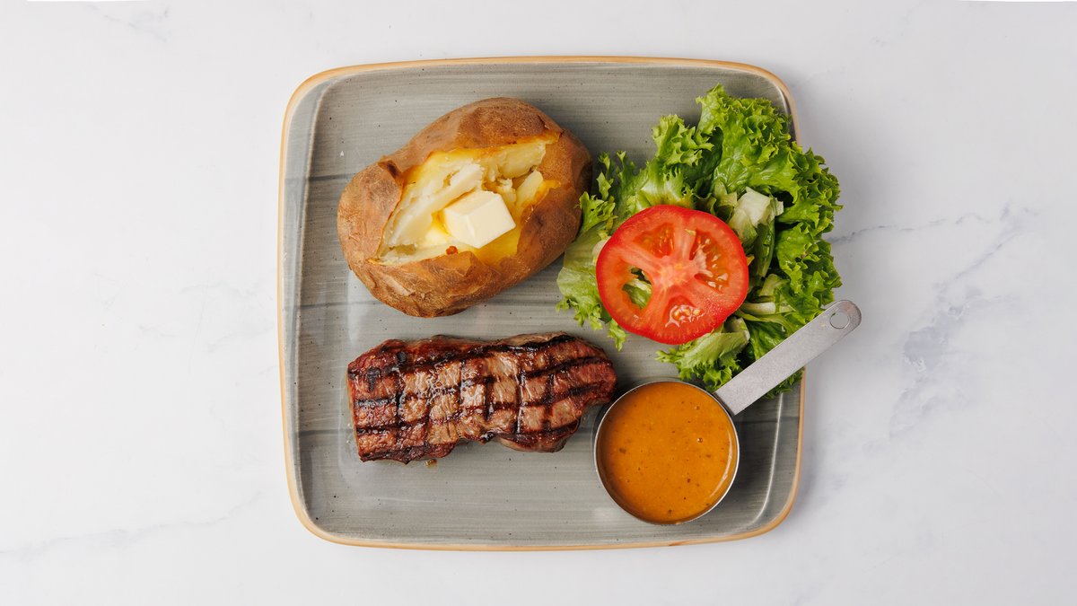 Alle steaks er fra grillen inklusiv valgfrie kartofler samt sauce.