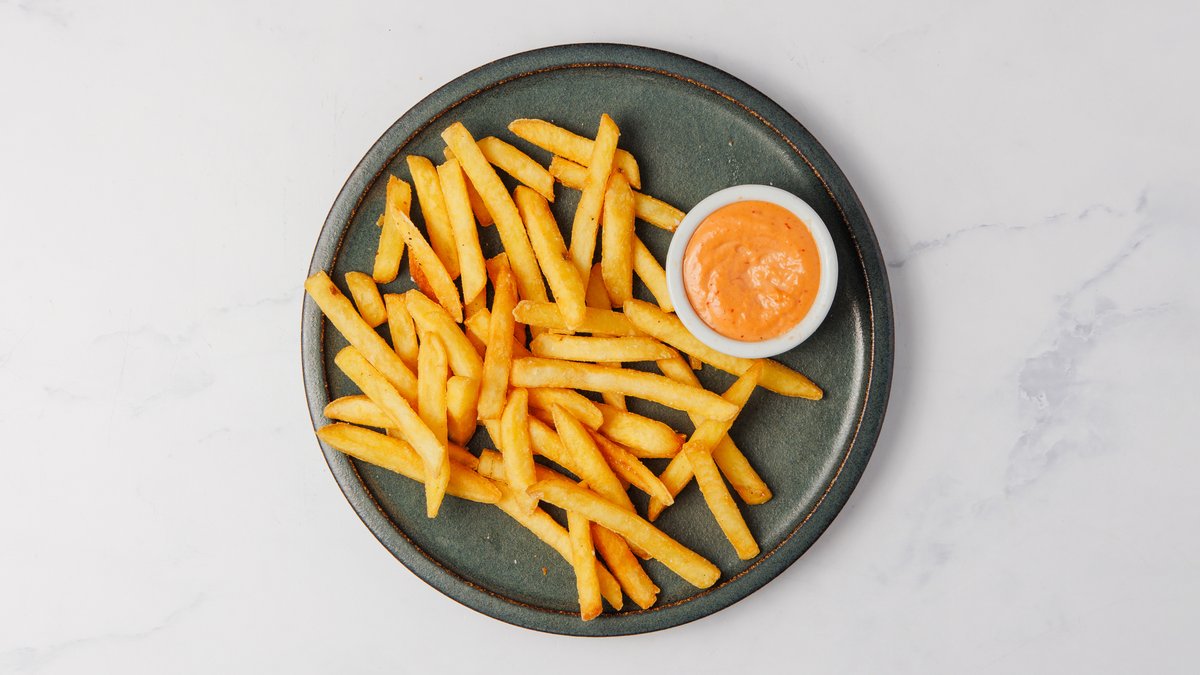 Serveres med pommes frites.