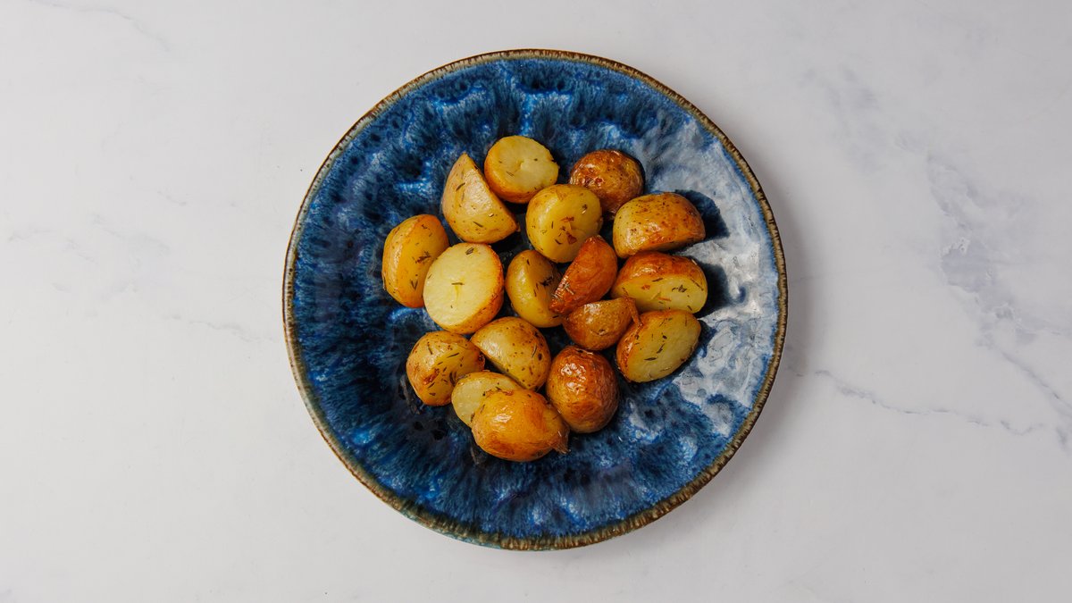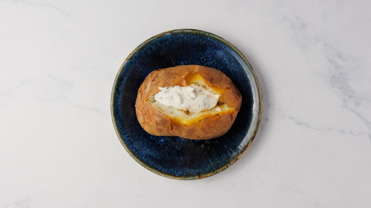 Bagt kartoffel med creme fraiche og purløg
