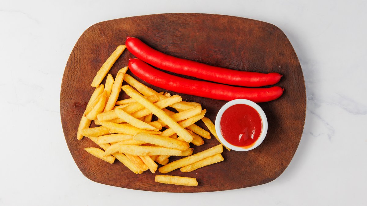 2 røde pølser serveret med pommes frites.