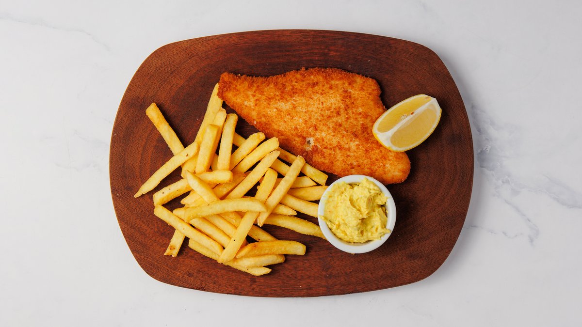 1 fiskefilet serveret med pommes frites.