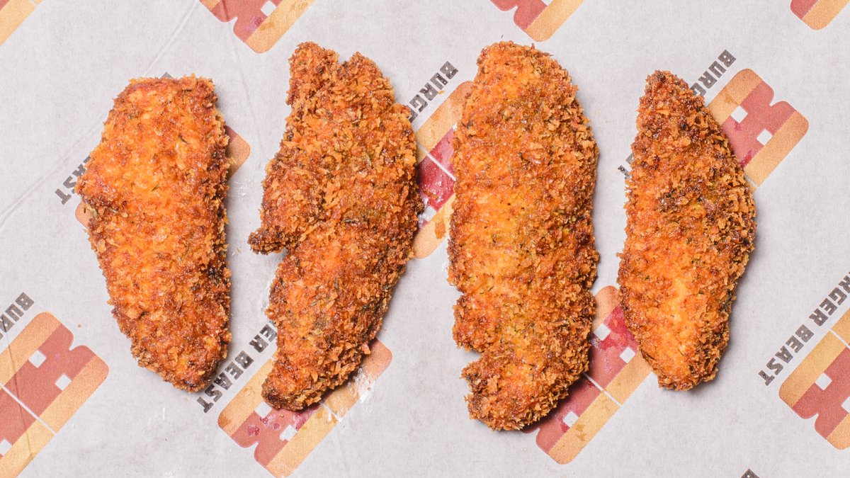Fire stykker southern fried, pankopaneret kyllingefilet.