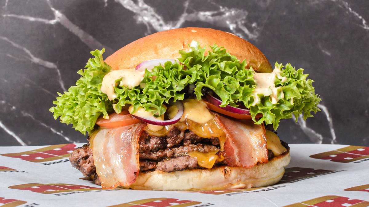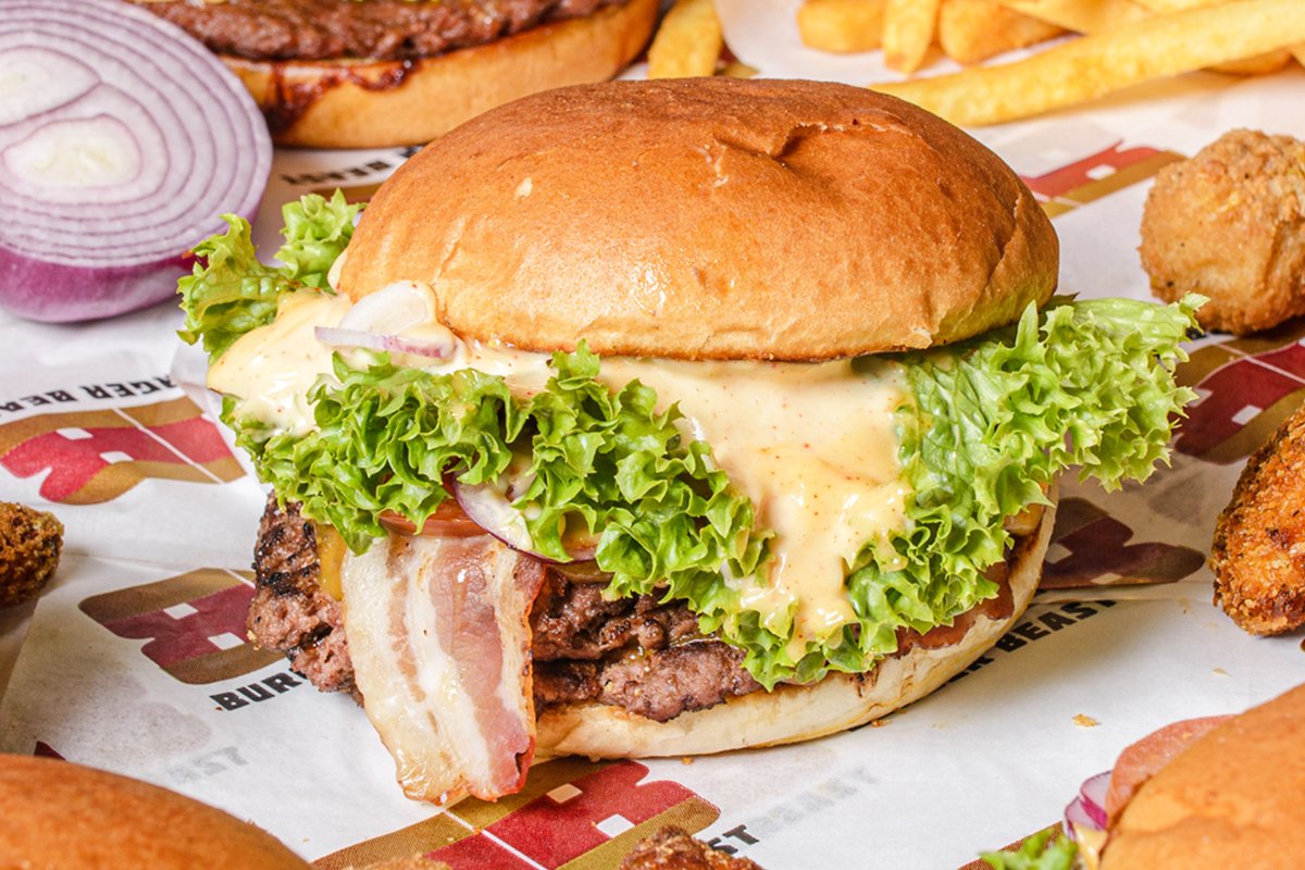Tre økologiske friskhakket bøffer af ca 85 gram hakket oksekød i en burger bolle med bacon, ost. syltede agurker, rødløg, tomat, salat og Burger Beast dressing. Serveres med pommes frites og en valgfri sodavand.
