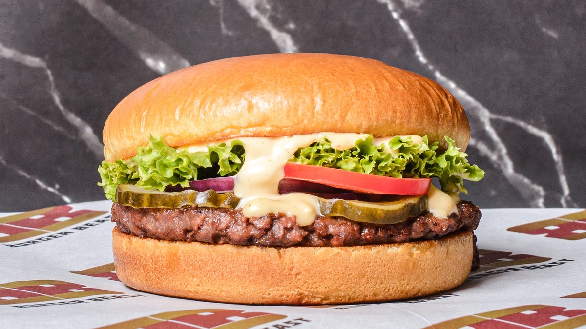 To økologiske friskhakket bøffer af ca 85 gram hver i en burgerbolle med cheddarost, rødløg, syltede agurker, tomat, salat og Burger Beast dressing.