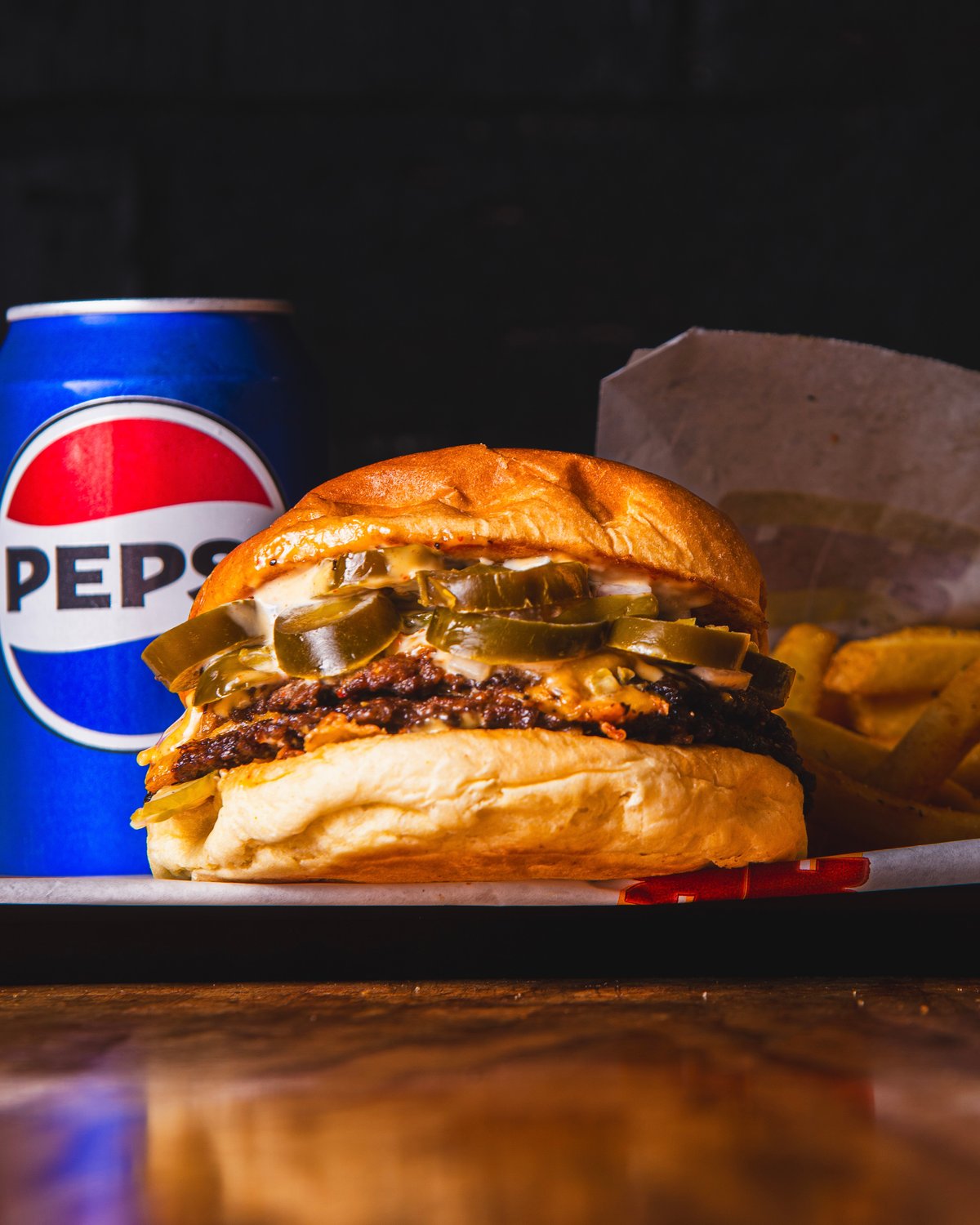 2 stk. økologisk hakkebøf på ca. 85 gram pr. stk., ristede løg, jelapeños, drue agurk og Beast relish dressing. Serveres med pommes frites og valgfri drikkevare.