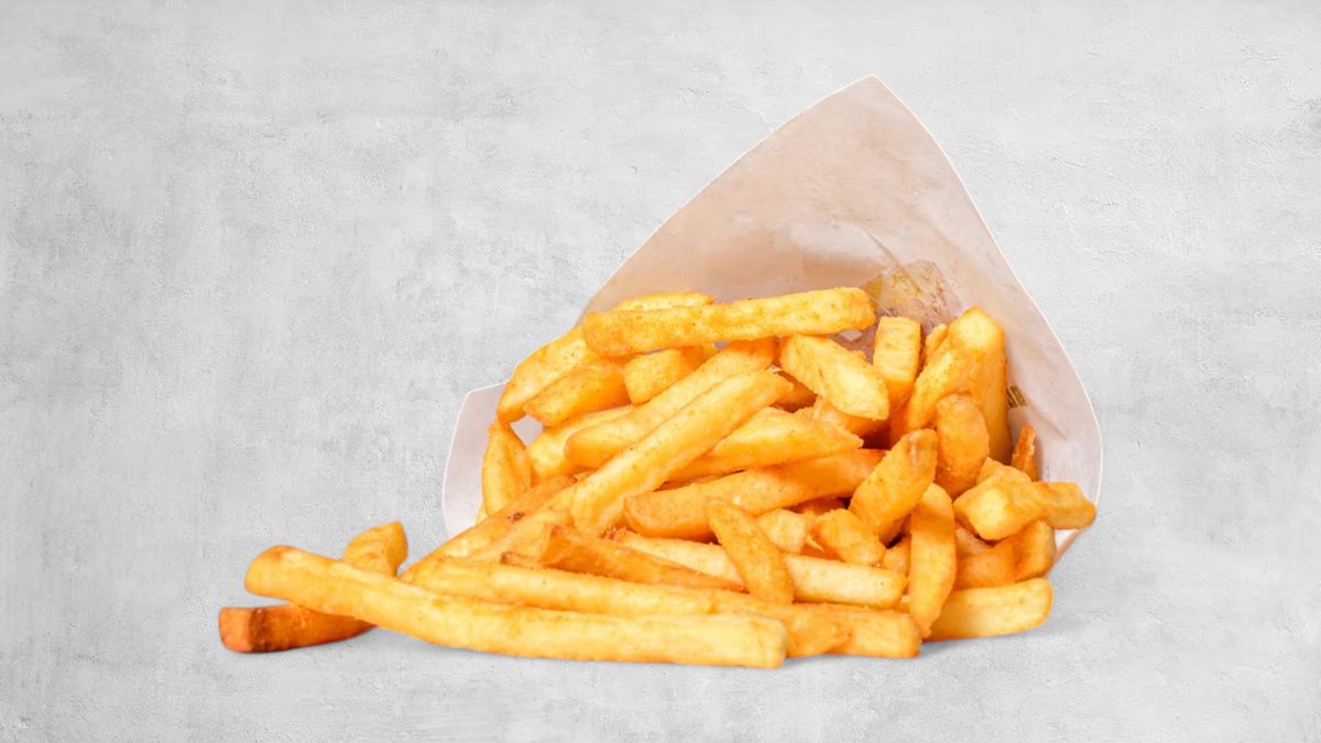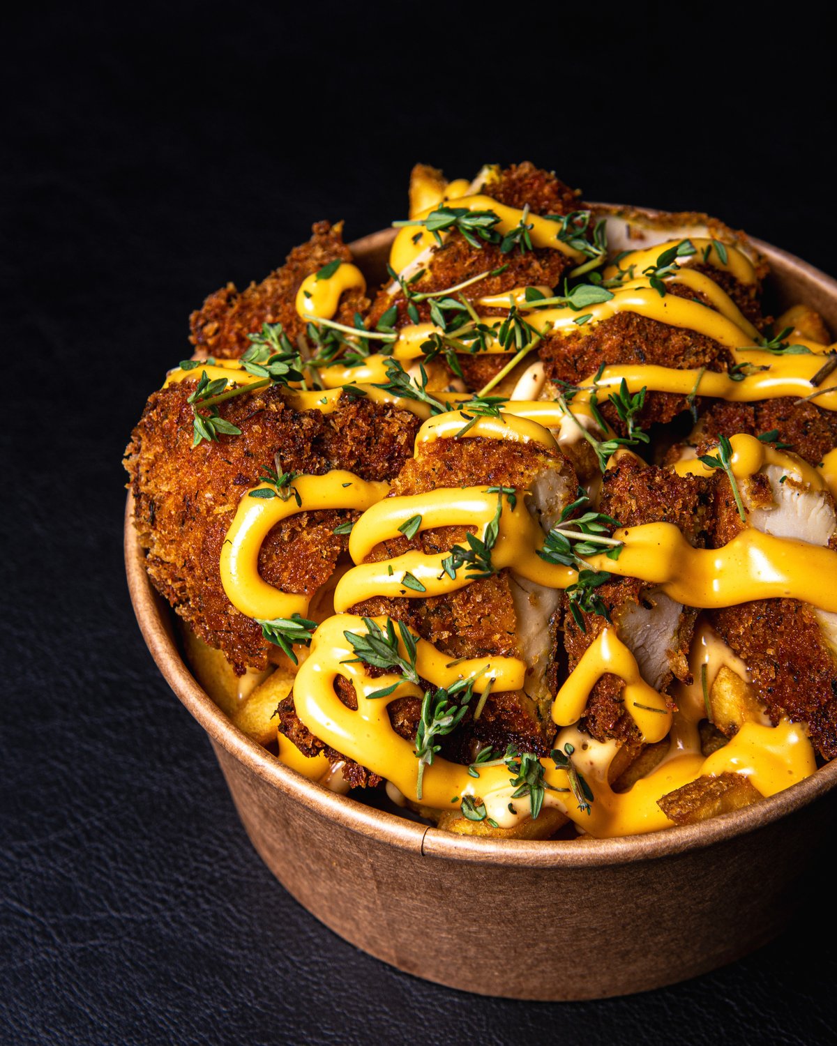 Pommes frites paneret kylling, Beast Dressing, smeltet ostdip samt Parmesan ost