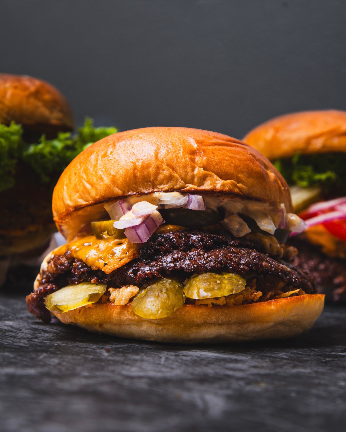 3 stk økologiske friskhakket bøffer af 85 gram hakket oksekød i en burger bolle med bacon, ost, syltede agurker, rødløg, tomat, salat og Burger Beast dressing.