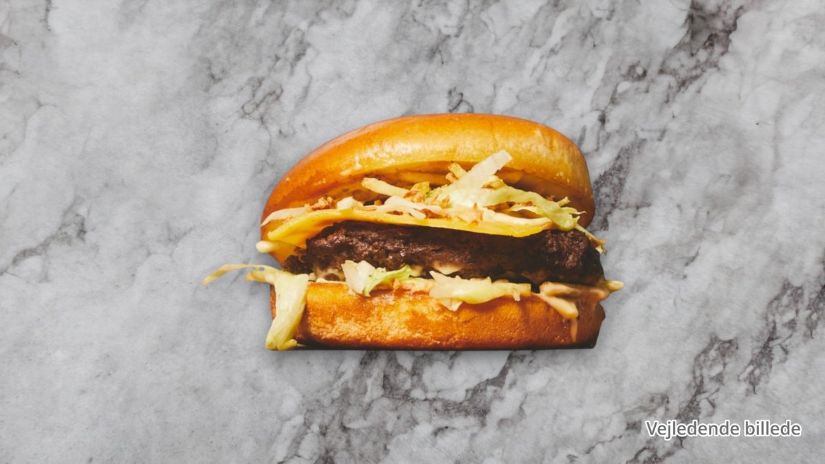 Briochebolle, hakkebøf af Himmerlands okse, smeltet rød cheddar, bacon, hjemmesyltede rødløg og grønt. Hertil krydrede fries med hjemmerørt kryddermayo.