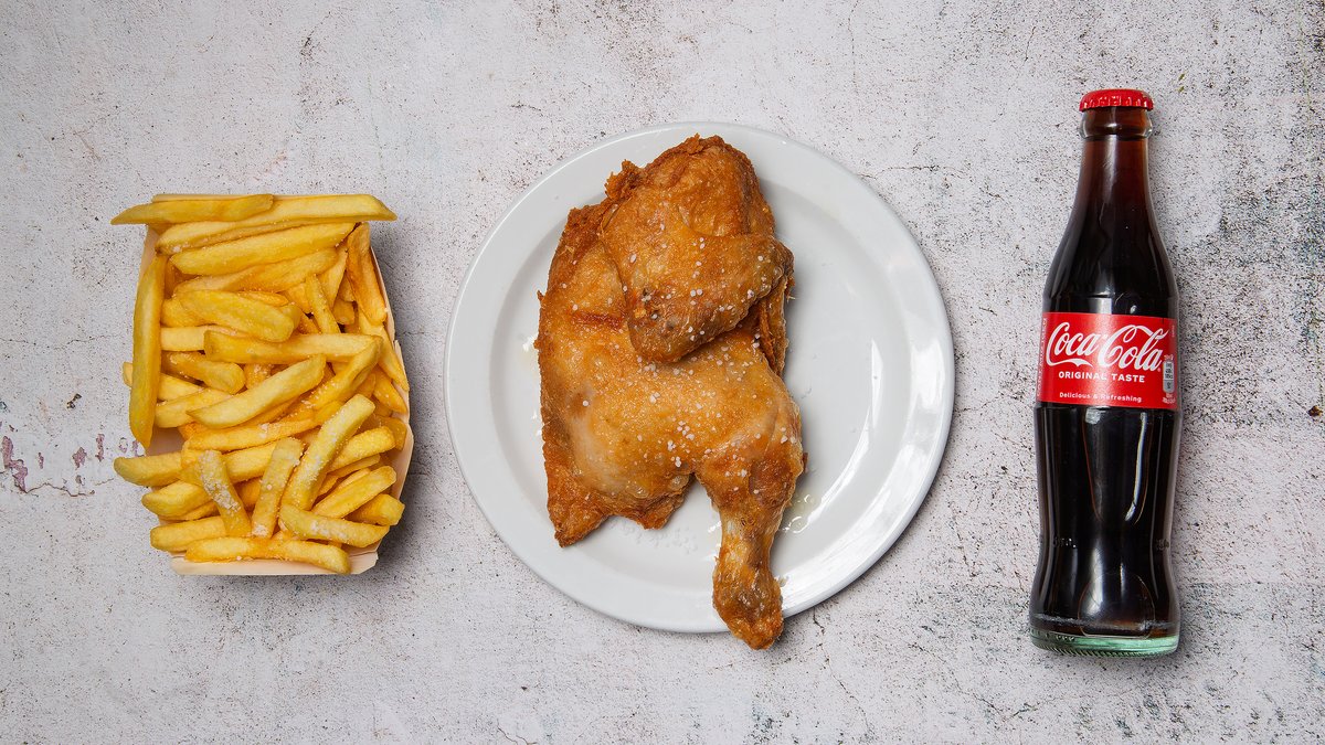 En halv grillkylling (Med pommes frites og sodavand)