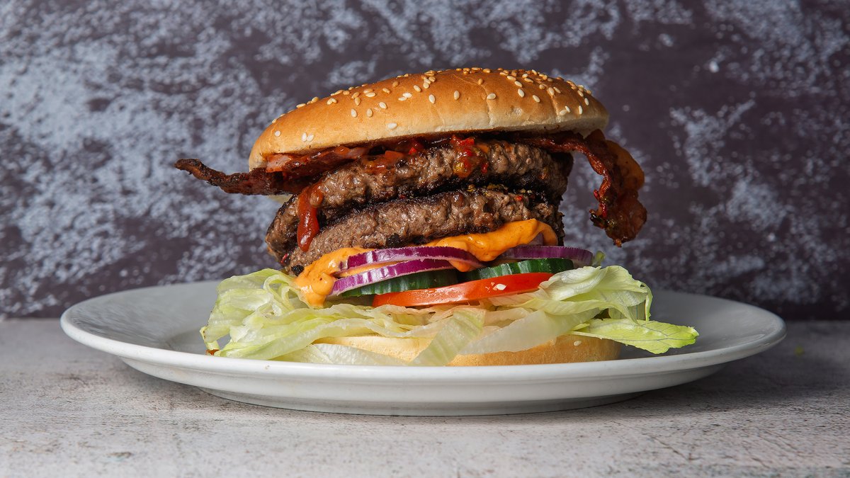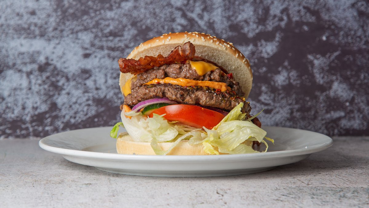 Burgerbolle med 250 gram oksebøf, bacon, frisk iceberg, frisk tomat, frisk agurk, friske rødløg, vores hjemmelavet silkedressing og ketchup