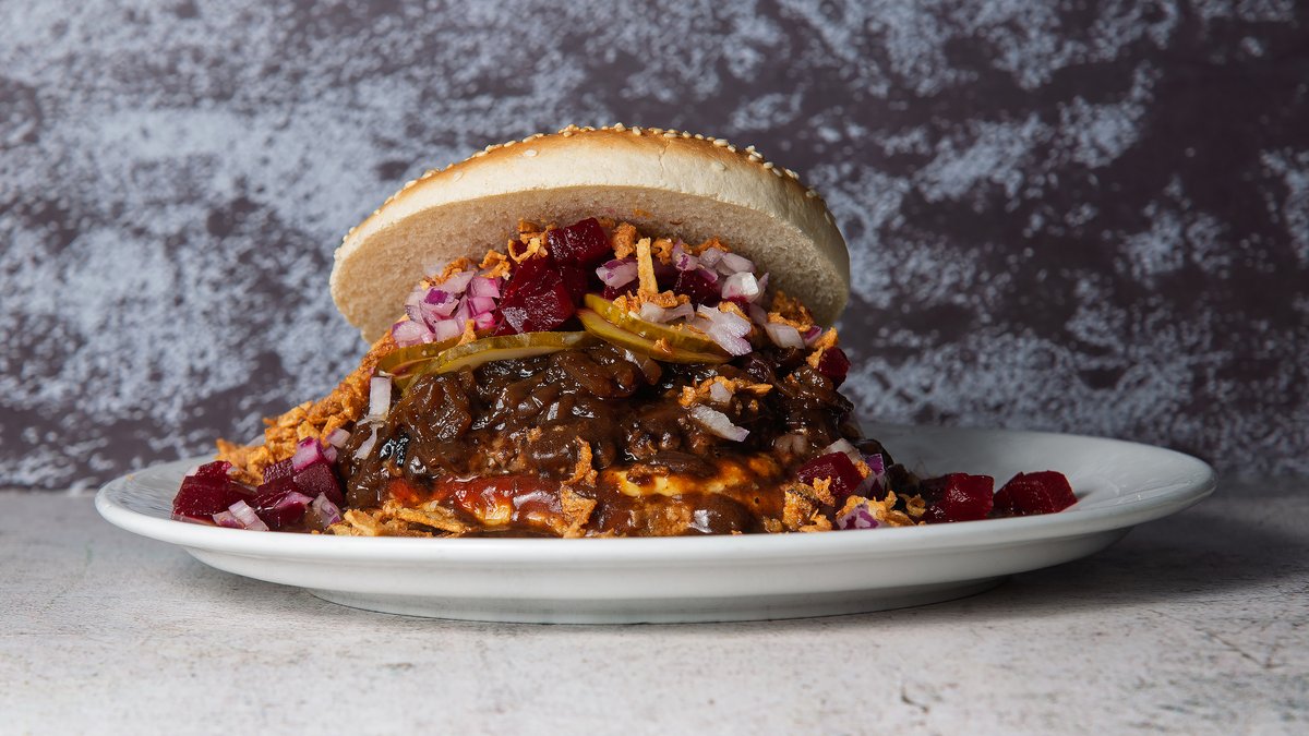 Burgerbolle med 125 g bøf, ketchup, remoulade, hjemmelavet brun sovs, hjemmelavet bløde løg, syltede agurker, rødbeder, rå løg, ristede løg
