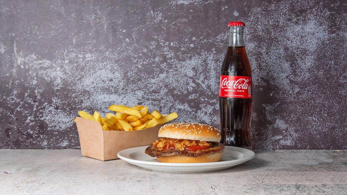 Serveres med en lille pommes frites og en valgfri 0,5 l sodavand