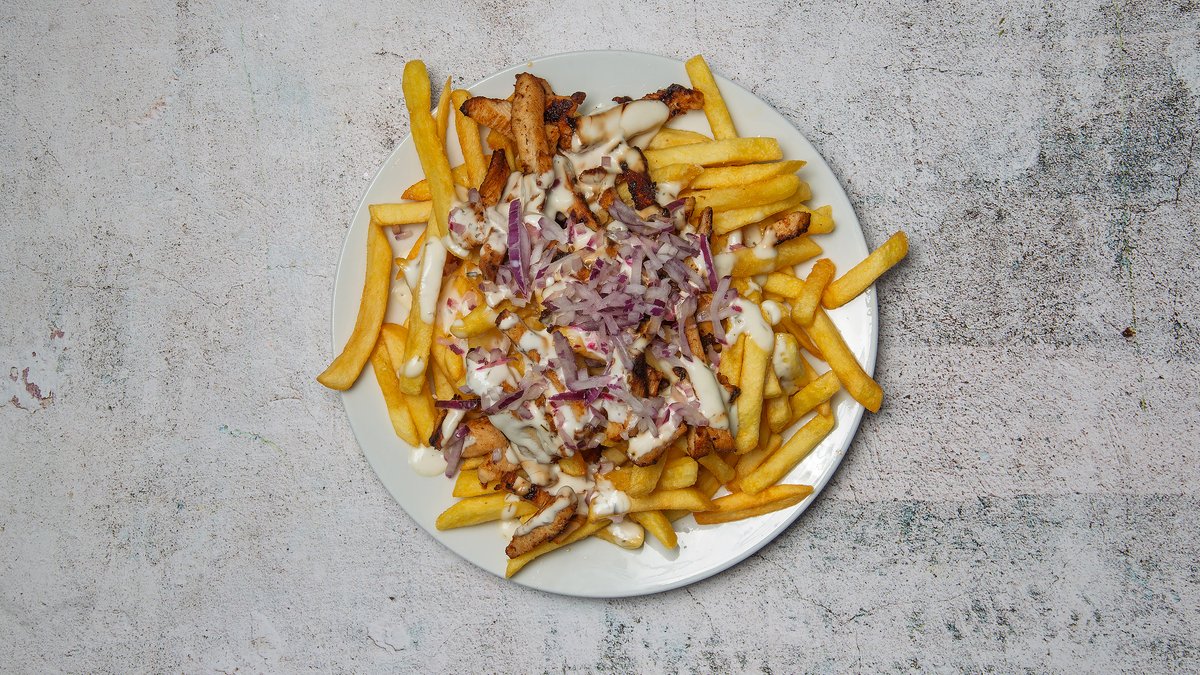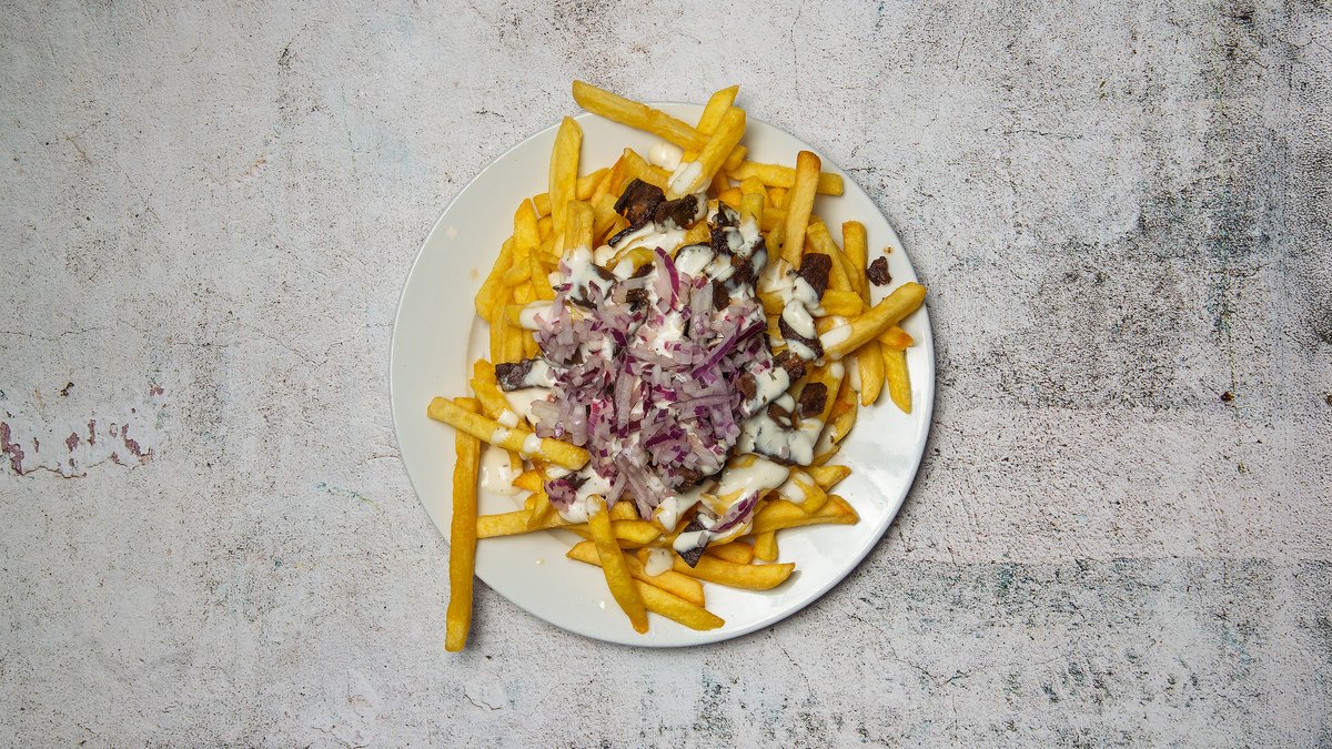 Kebab vendt med pommes frites, med creme fraiche dressing og rå løg