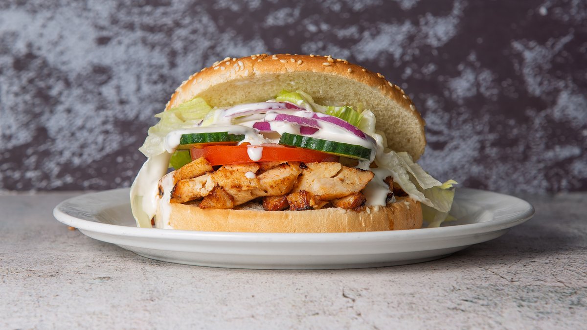 Burgerbolle med kylling i skriver, frisk iceberg, frisk tomat, frisk agurk, friske rødløg og creme fraiche dressing