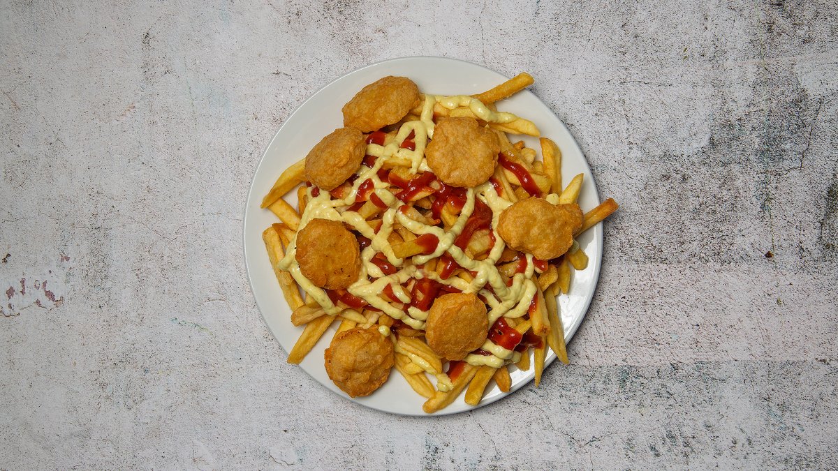 Nuggets vendt med pommes frites, med ketchup og remoulade