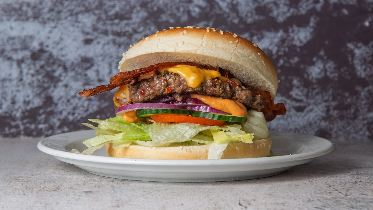 Burgerbolle med 125 gram oksebøf, bacon, frisk iceberg, frisk tomat, frisk agurk, friske rødløg, vores hjemmelavet silkedressing og ketchup