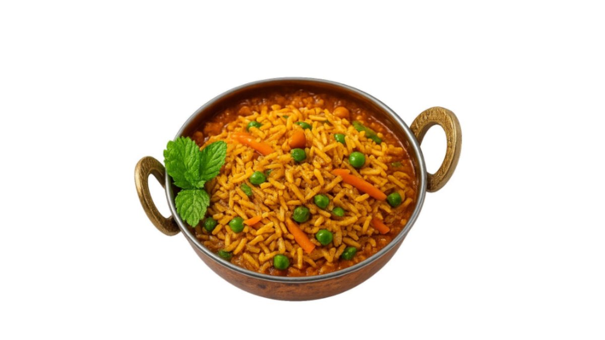 Langkornet ris tilberedt med grøntsager, stegte løg, krydderier og friske urter. Serveres med raita.