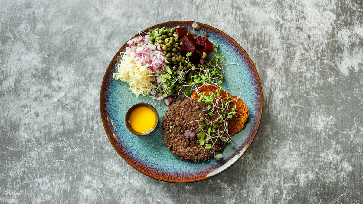 Serveret med rå løg, peberrod, syltede rødbeder, capers og rå æggeblomme.