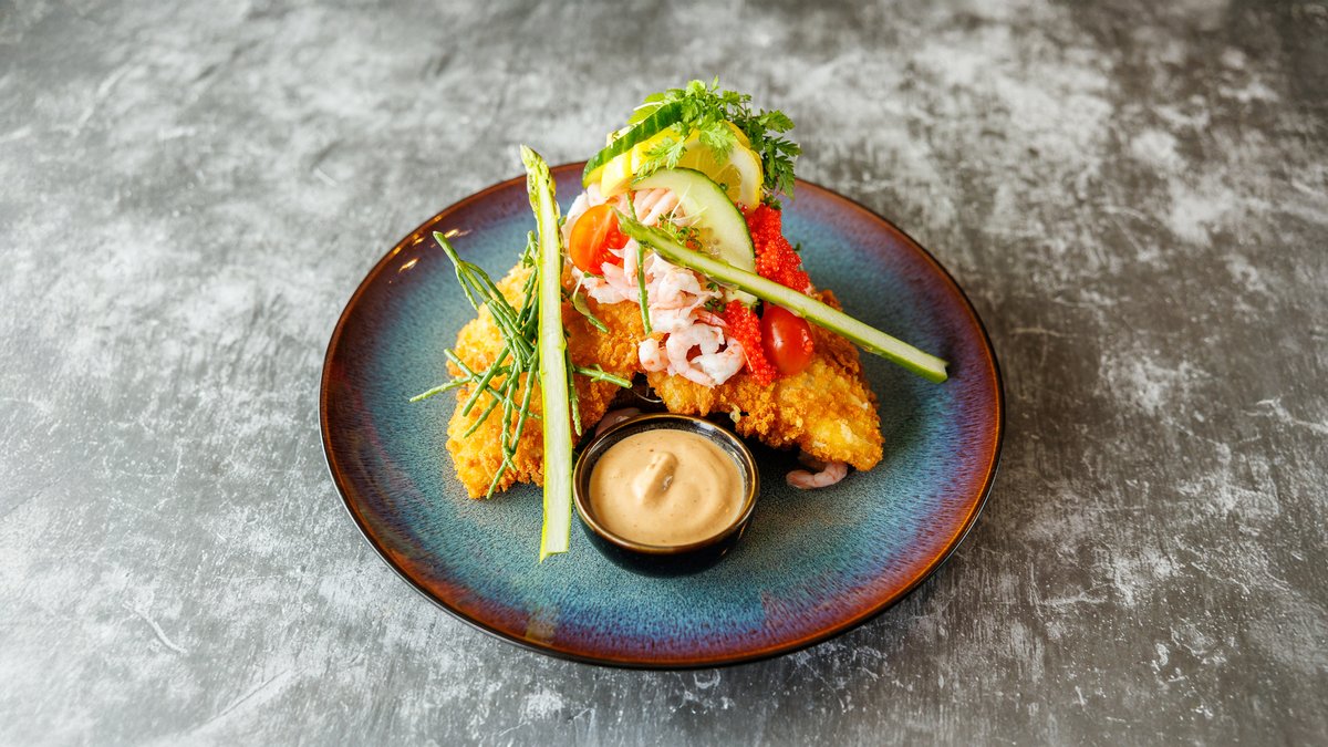2 stegte danske rødspættefileter på smørristet surdejsbrød, håndpillede rejer, 1000 øers dressing, dampede asparges, toppet med rogn.
