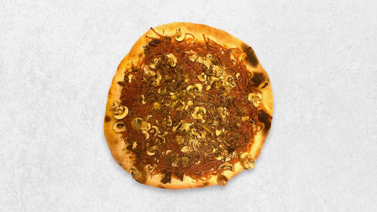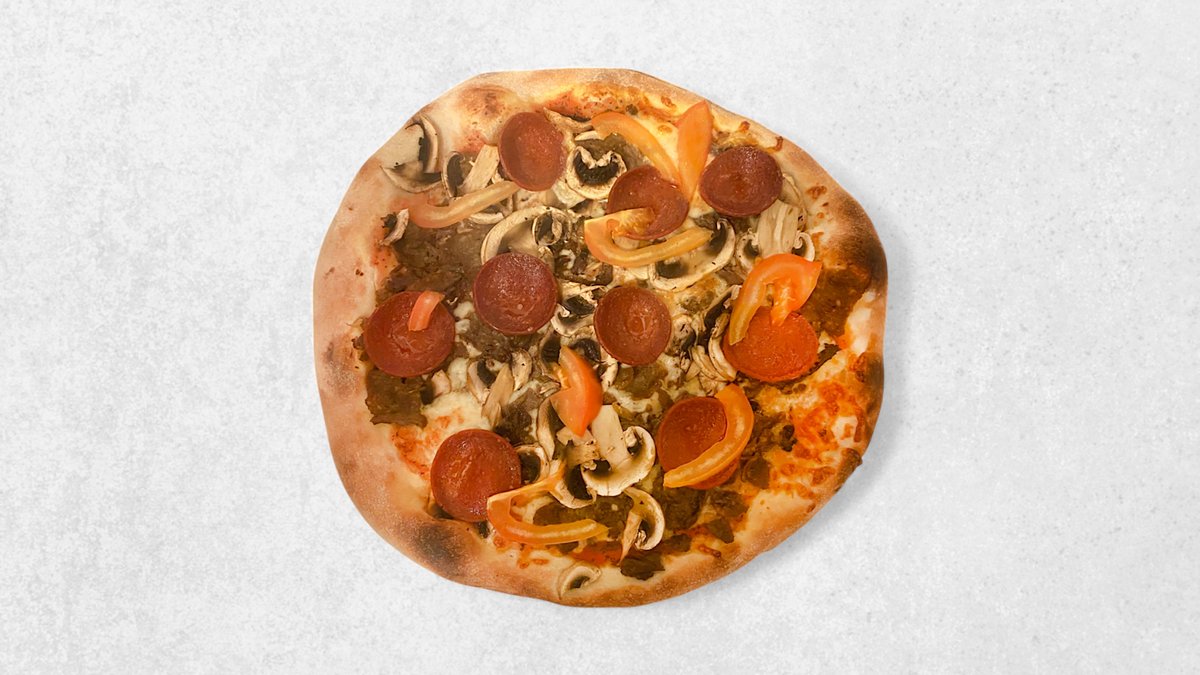 Tomat, ost, champignon, pepperoni, bacon og kødsauce.