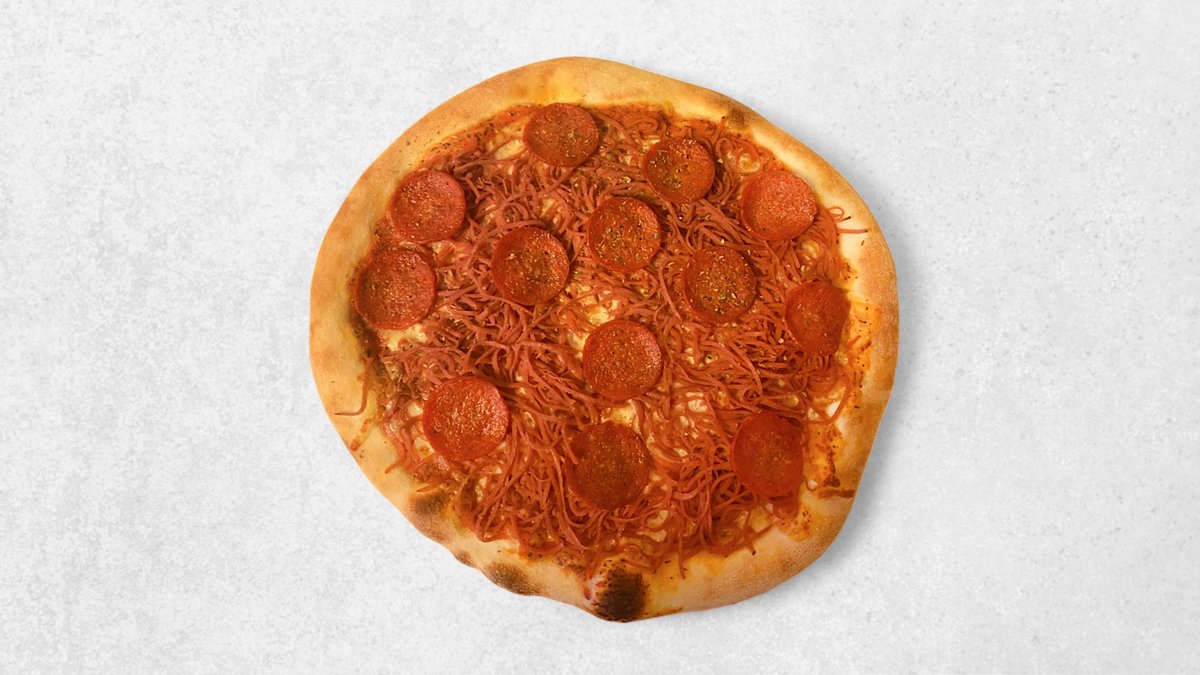 Tomat, ost, oksekød, skinke, champignon, bacon, cocktailpølser, majs, pepperoni, hvidløg og chili.