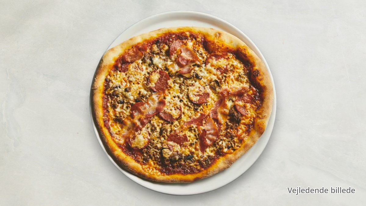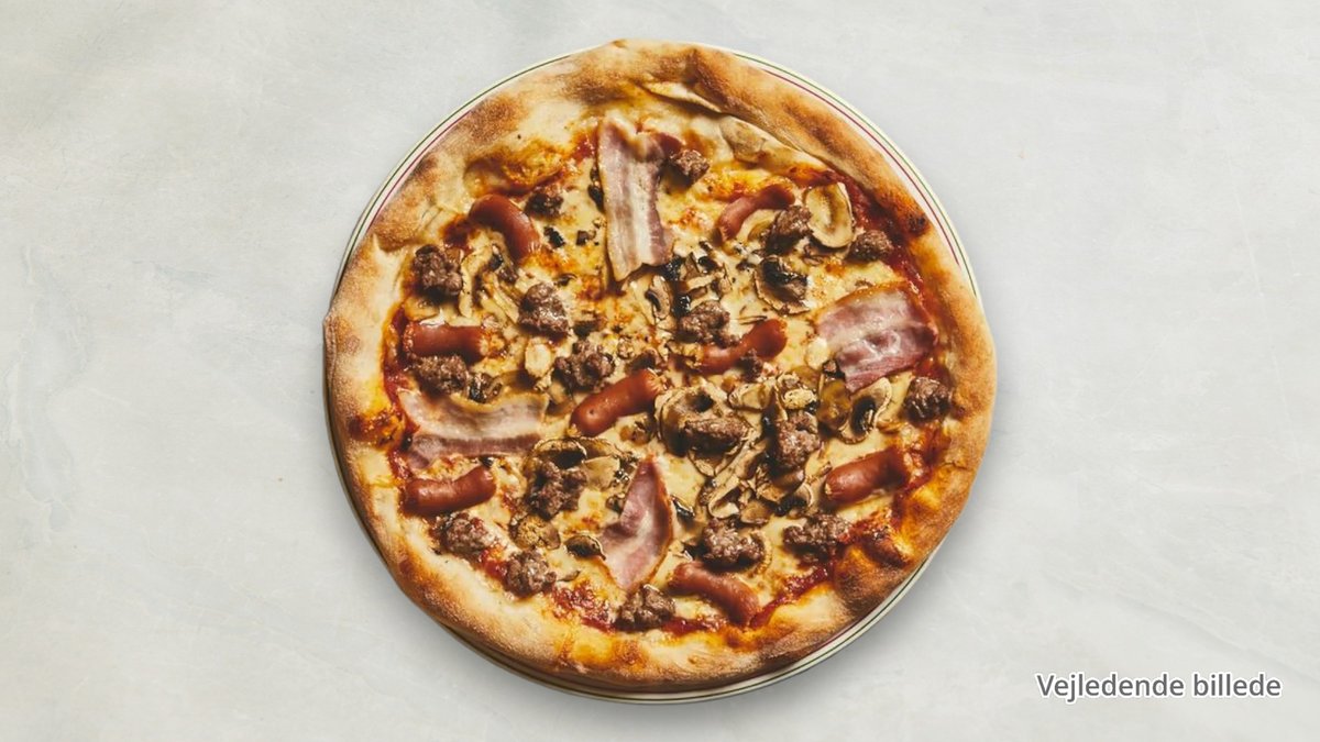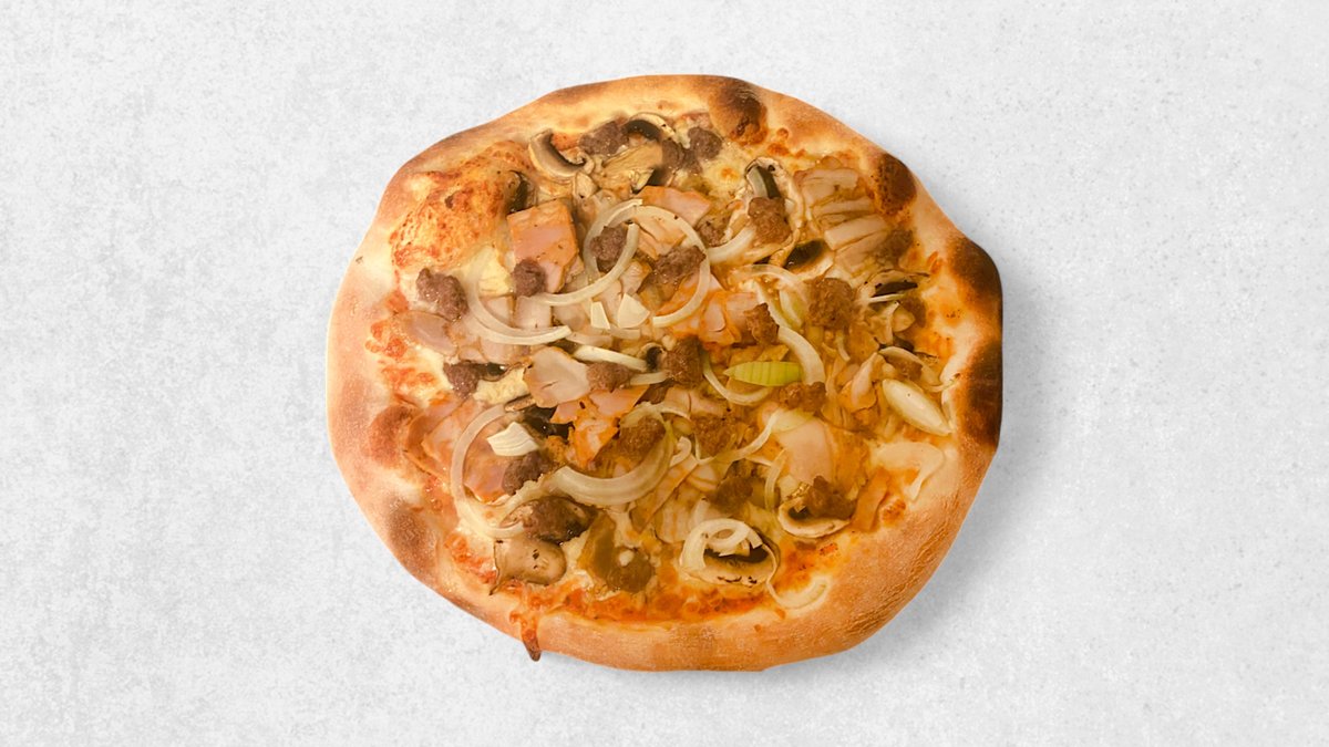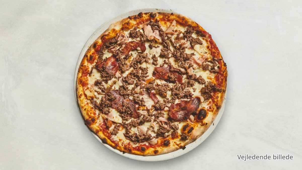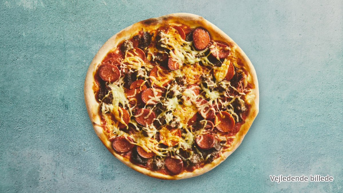 Tomat, ost, oksekød, skinke, champignon, bacon og cocktailpølser.