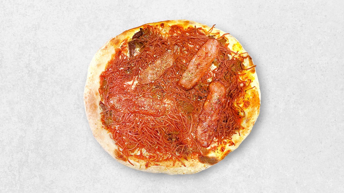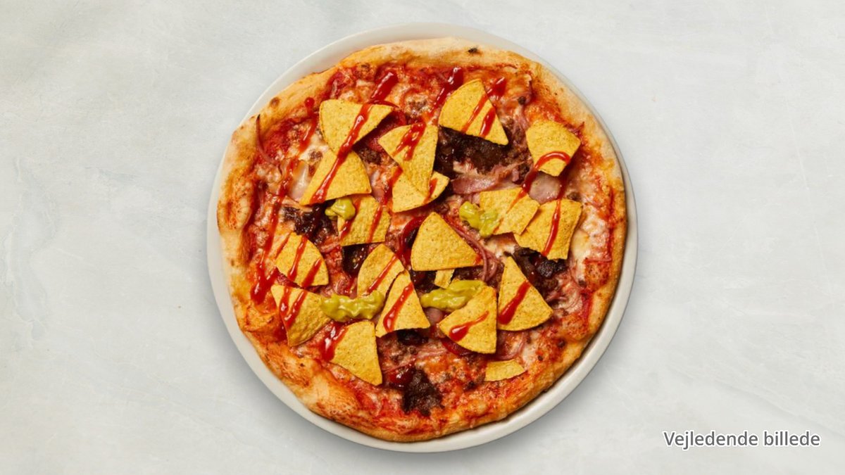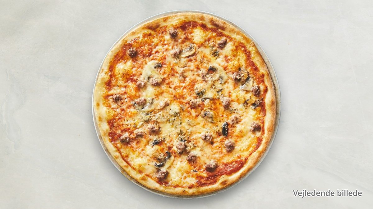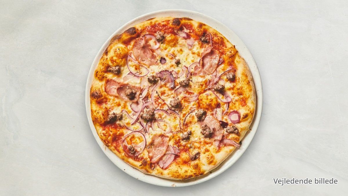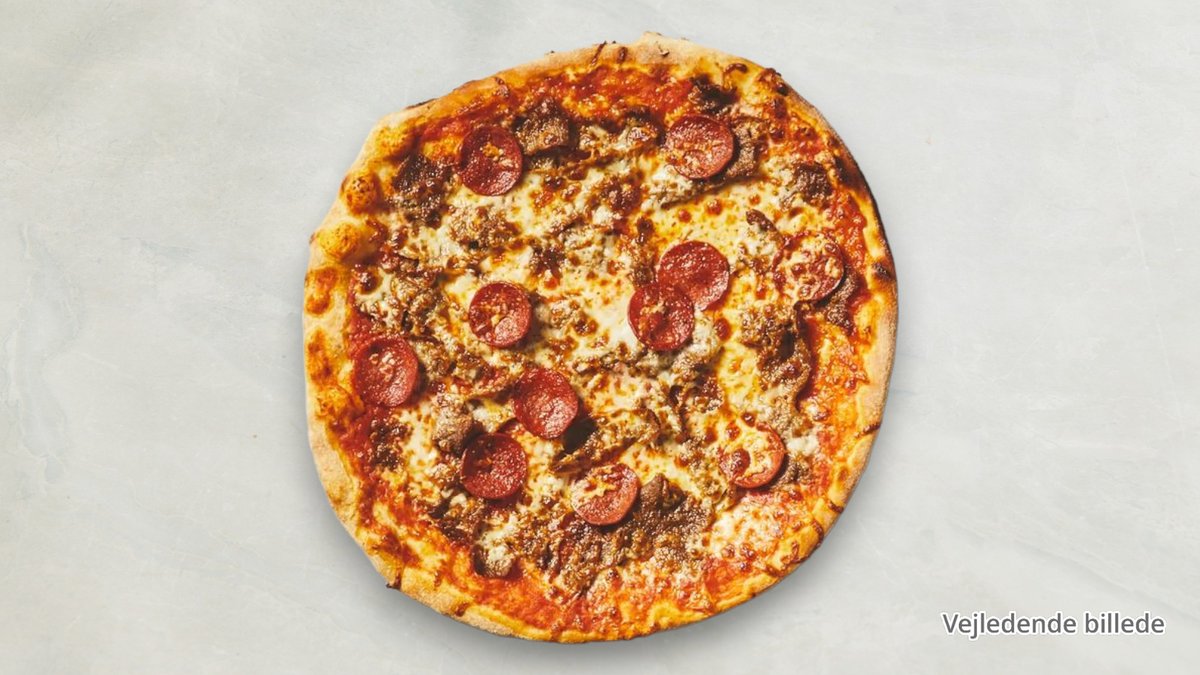 Tomat, ost, oksekød, skinke, champignon, bacon og cocktailpølser.