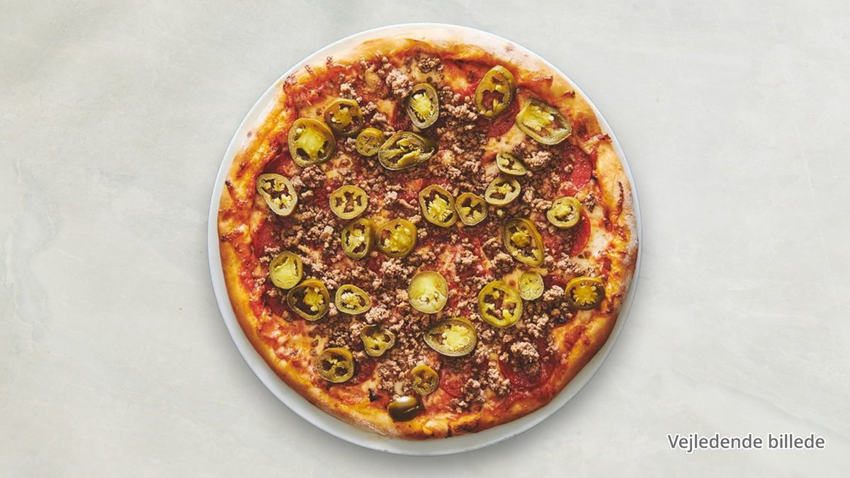 Tomat, ost, kylling, oksekød, champignon og jalapeños.