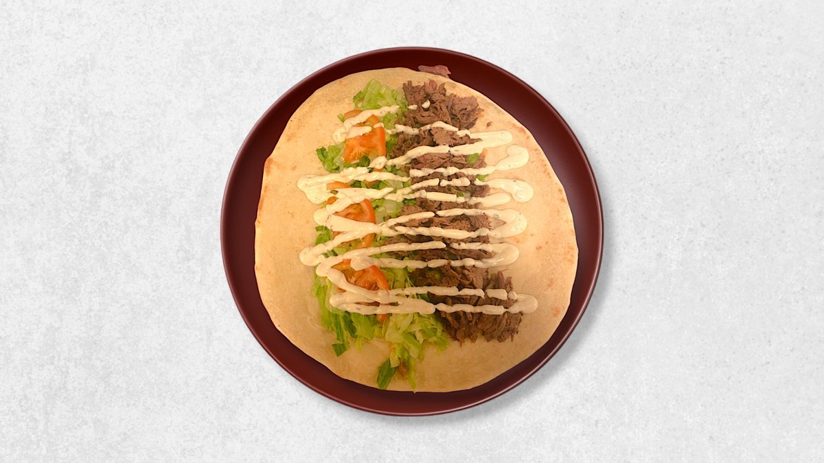 Durum med fyld af valgfri protein, salat og dressing.