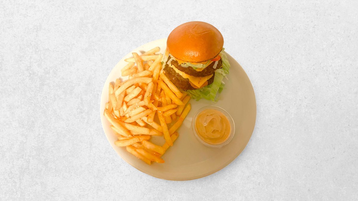 Burger med 2 bøffer af oksekød, 2 x ost, salat, agurk, tomat, iceberg, ketchup og burgerdressing. Serveres med krydrede pommes frites.