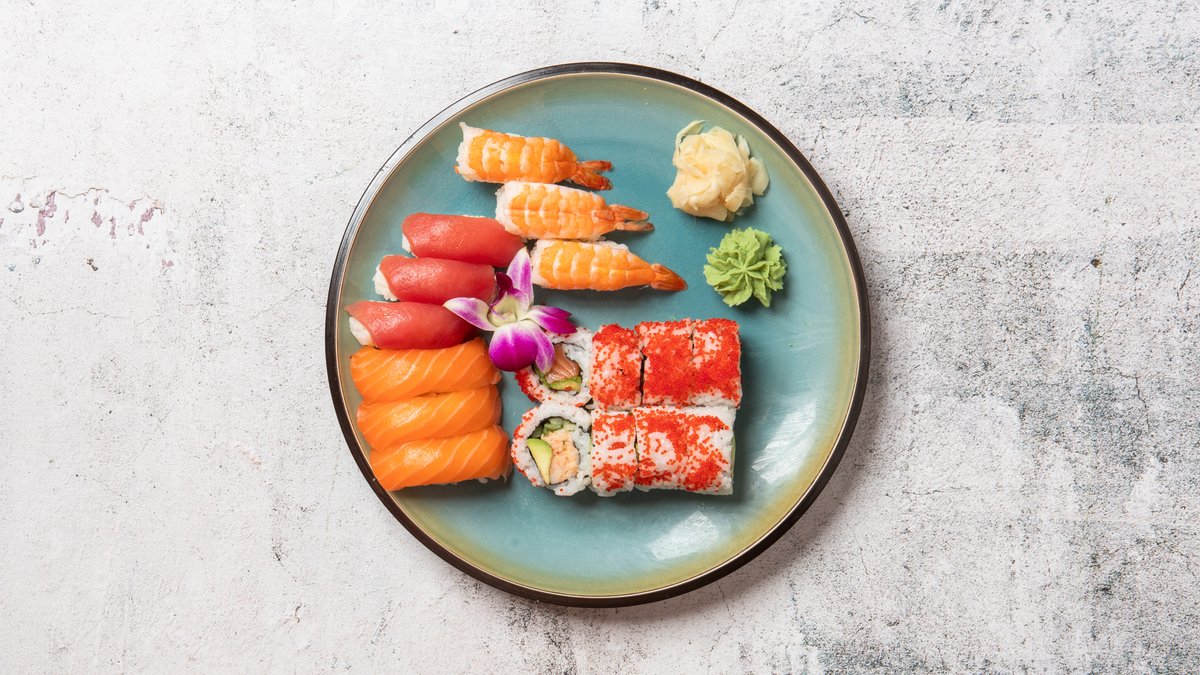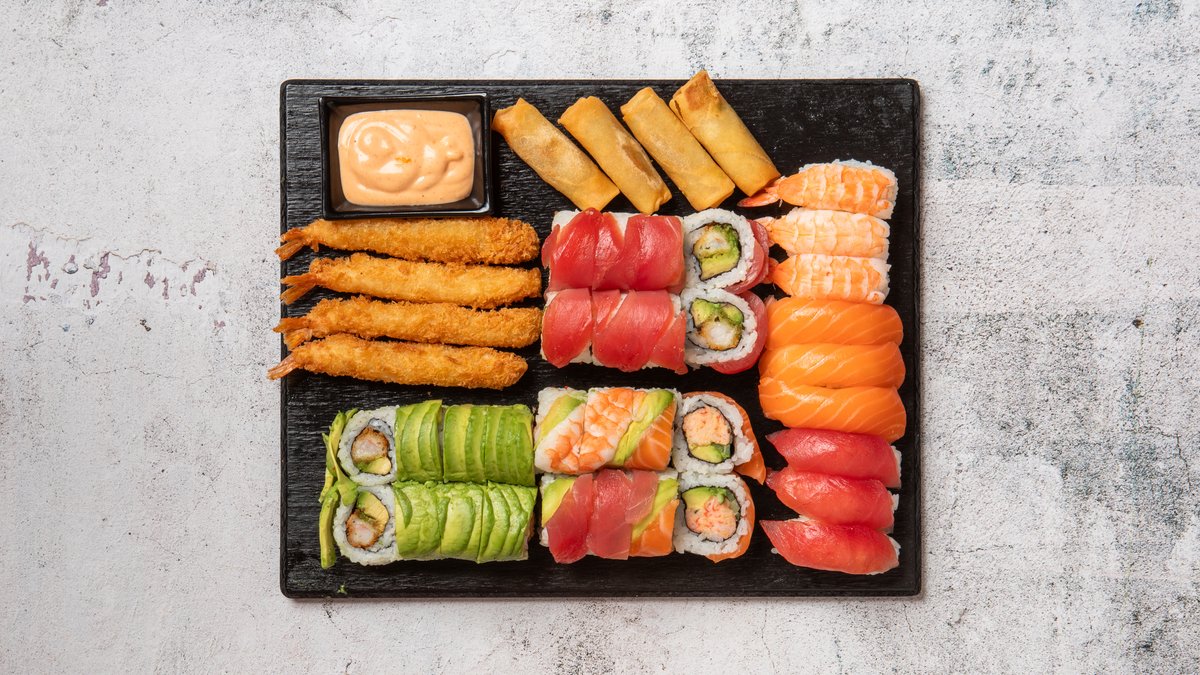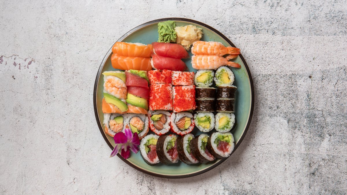 Nigiri: 2 x Laks 2 x Tun 2 x Rejer Uramaki: 4 x Laks, avocado, agurk & spicy mayo 4 x Surimi, avocado & agurk