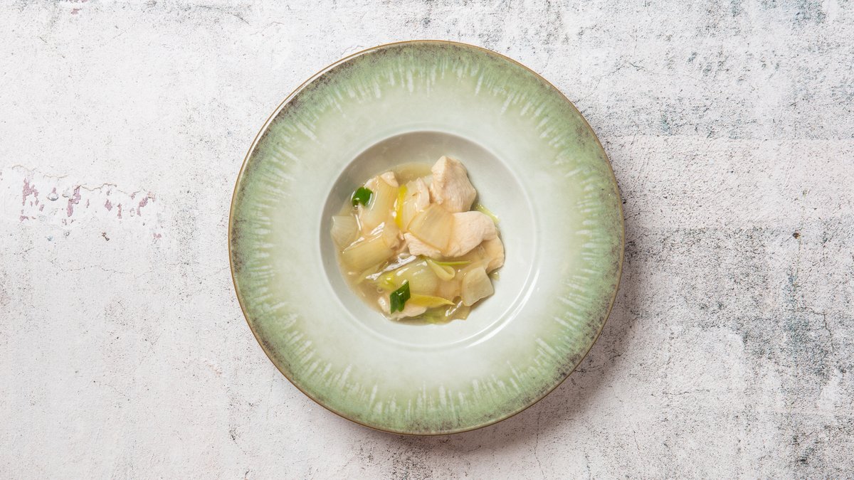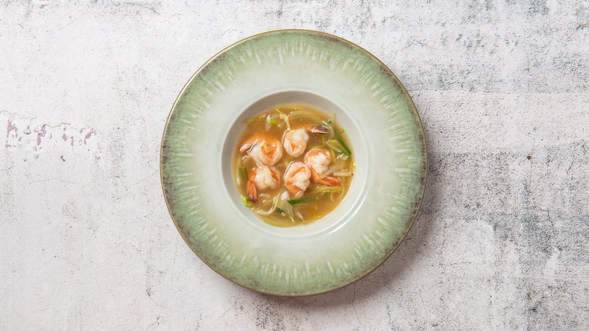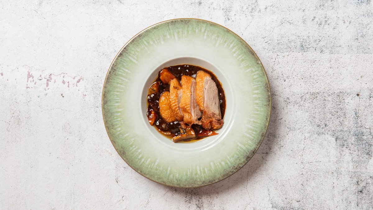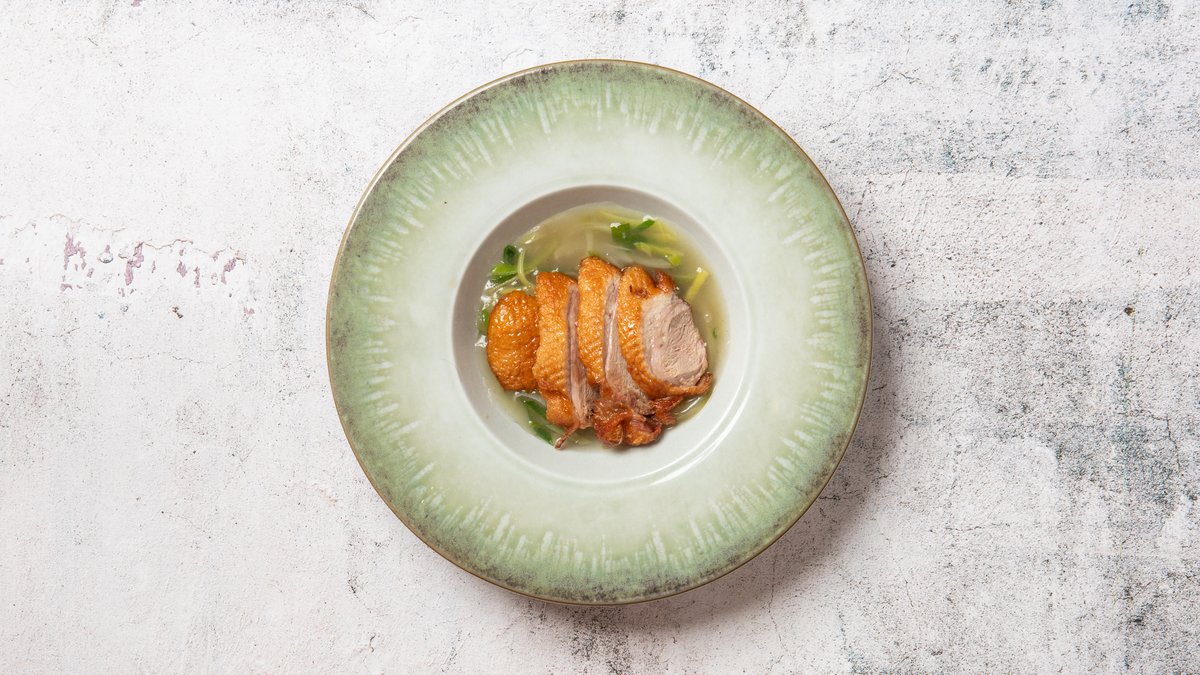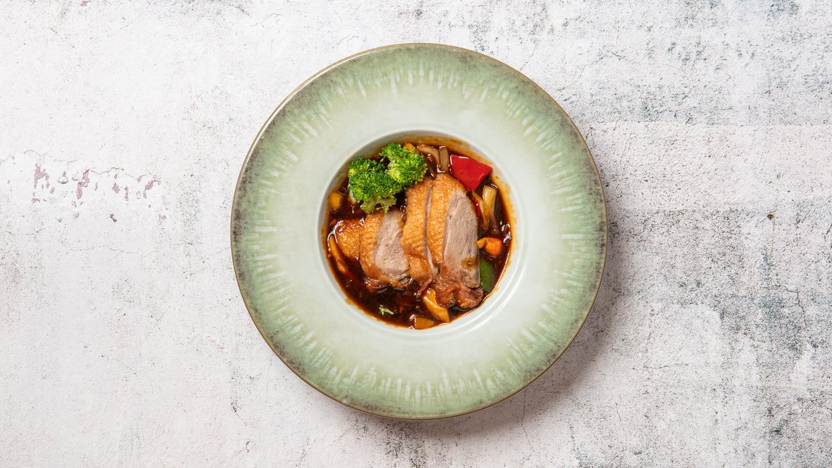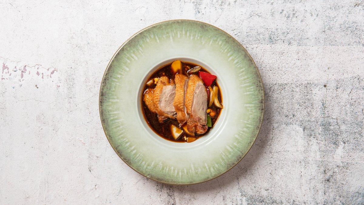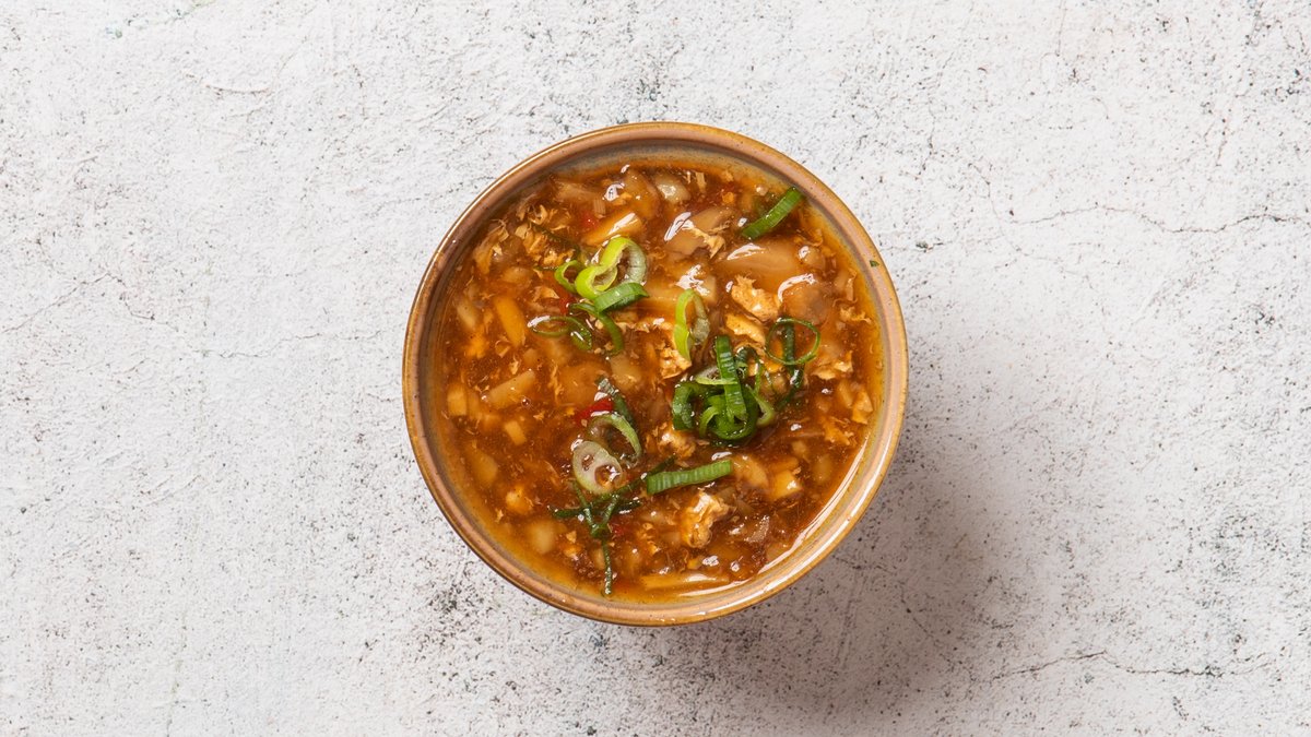 En lidt stærk suppe med andekød, æg og forskellige grøntsager.