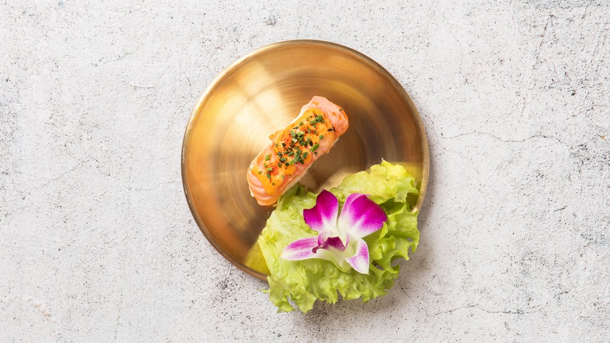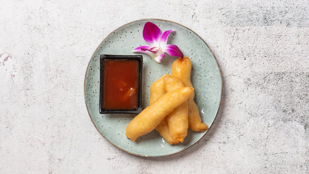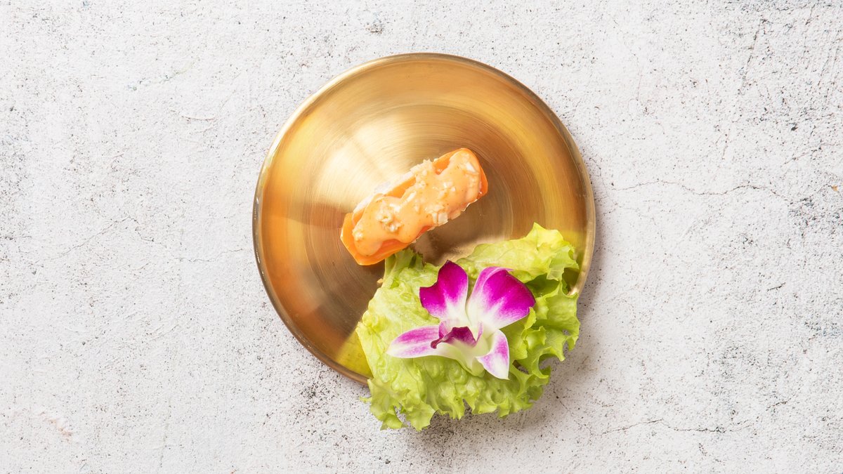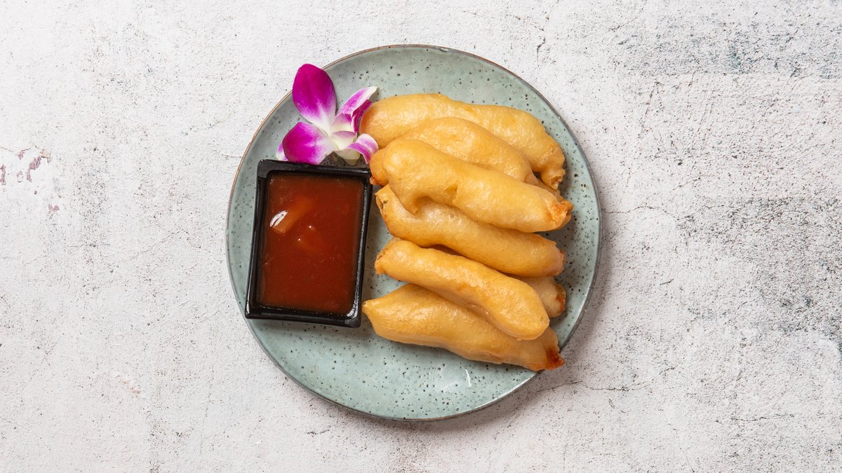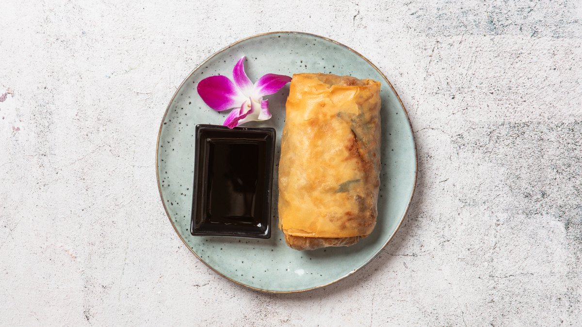 Forårsrulle med hakket oksekød og grøntsager. Serveres med soya.