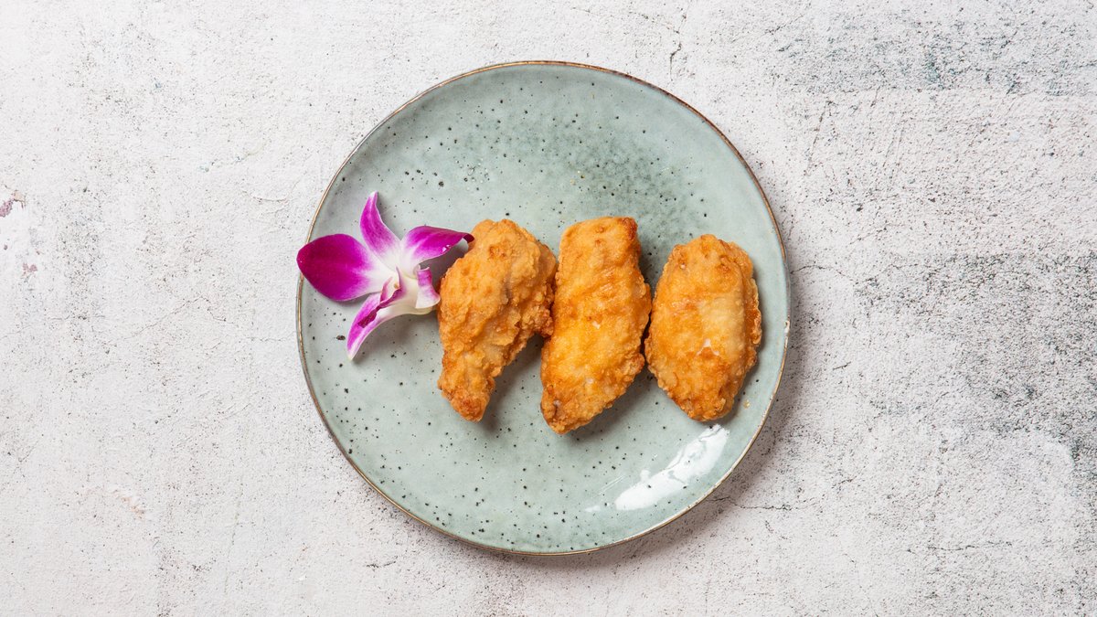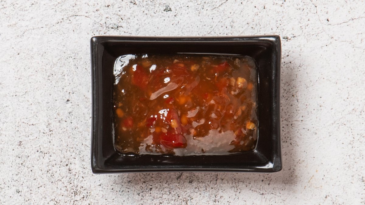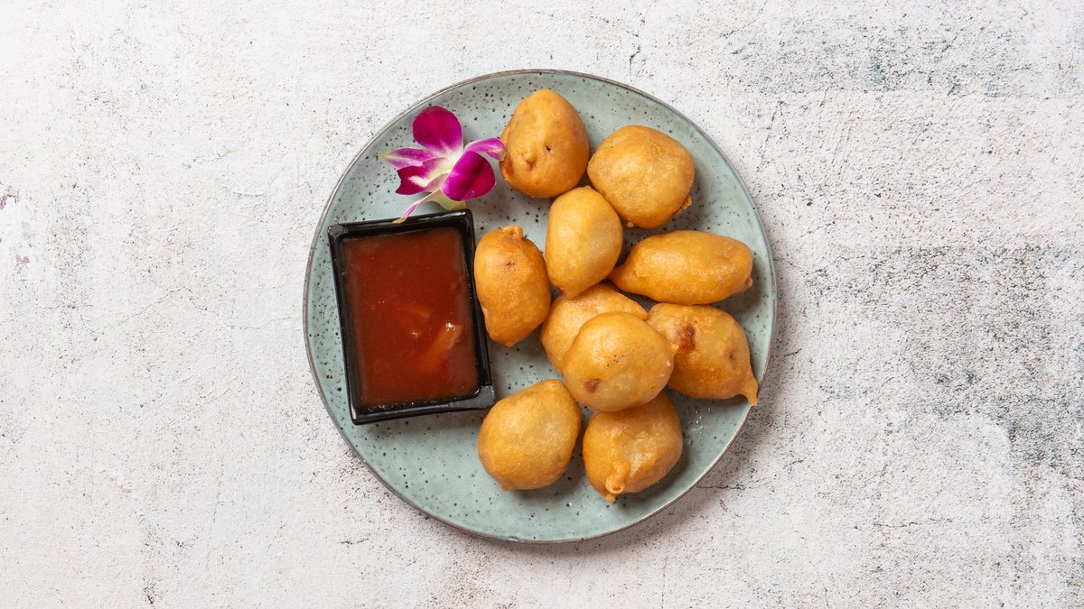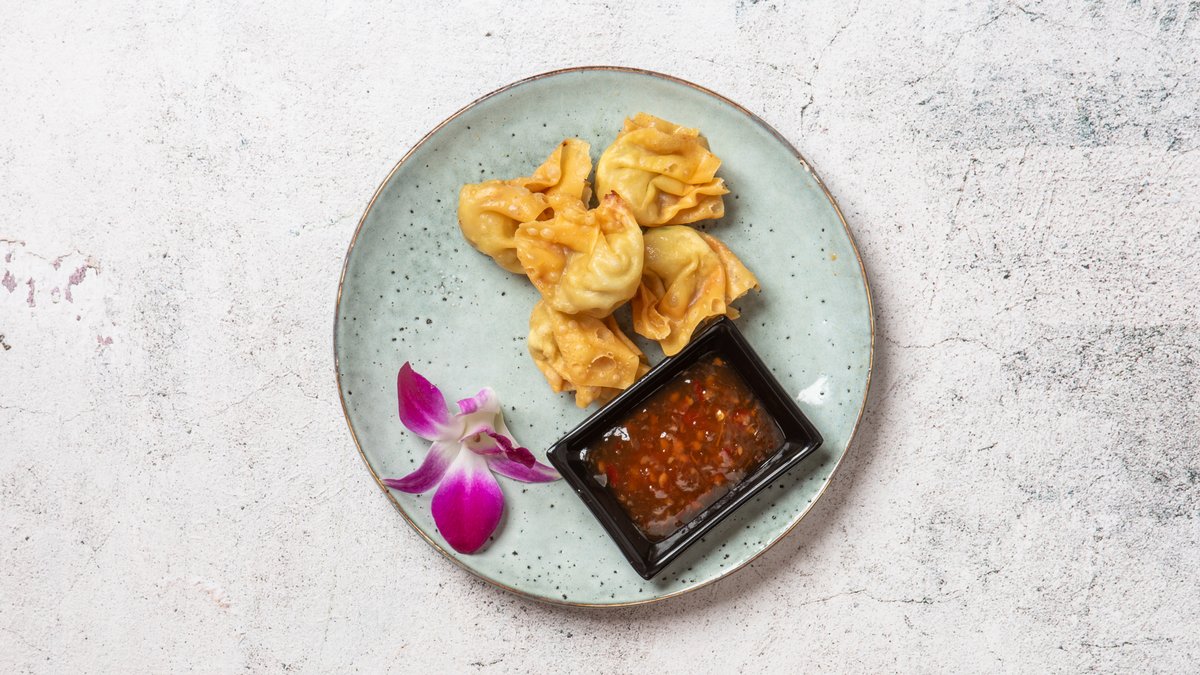 Wan-tans med hakket svinekød og grøntsager. Serveres med sød chilisauce.